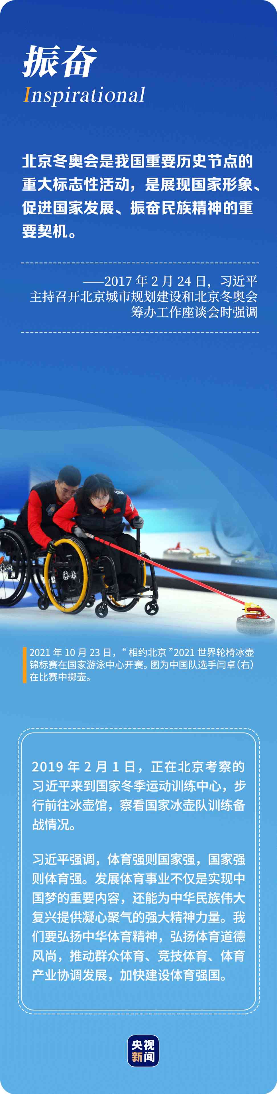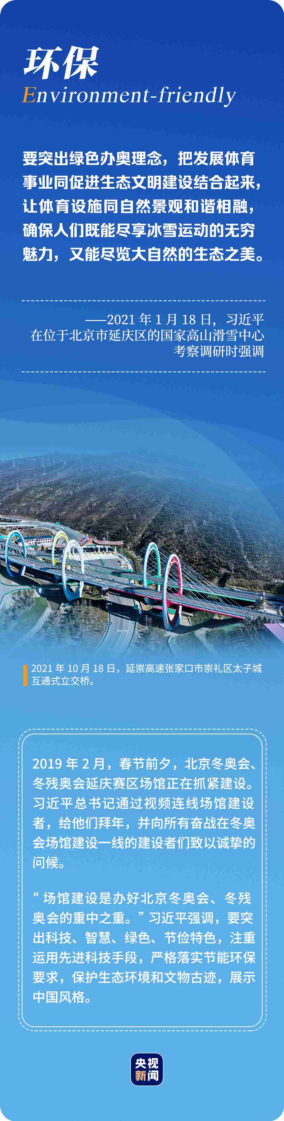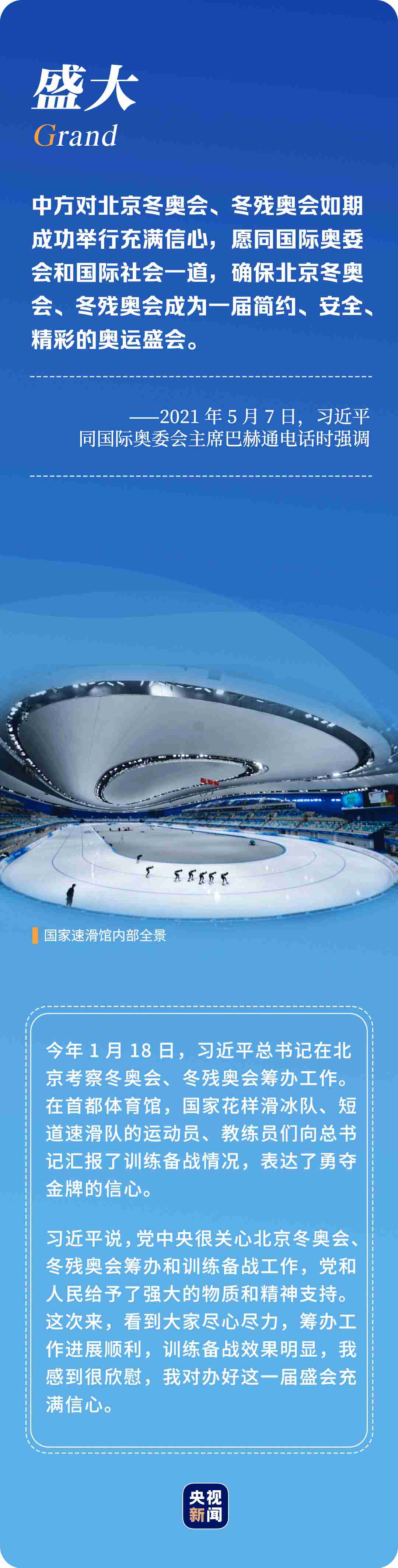 “辦好北京冬奧會(huì)、冬殘奧會(huì)是黨和國(guó)家的一件大事,是我們對(duì)國(guó)際社會(huì)的莊嚴(yán)承諾,做好北京冬奧會(huì)、冬殘奧會(huì)籌辦工作使命光榮、意義重大?!?年多來(lái),習(xí)近平總書記始終惦記著冬奧會(huì)籌辦進(jìn)展,多次實(shí)地考察、主持召開重要會(huì)議部署推進(jìn)冬奧籌辦工作。