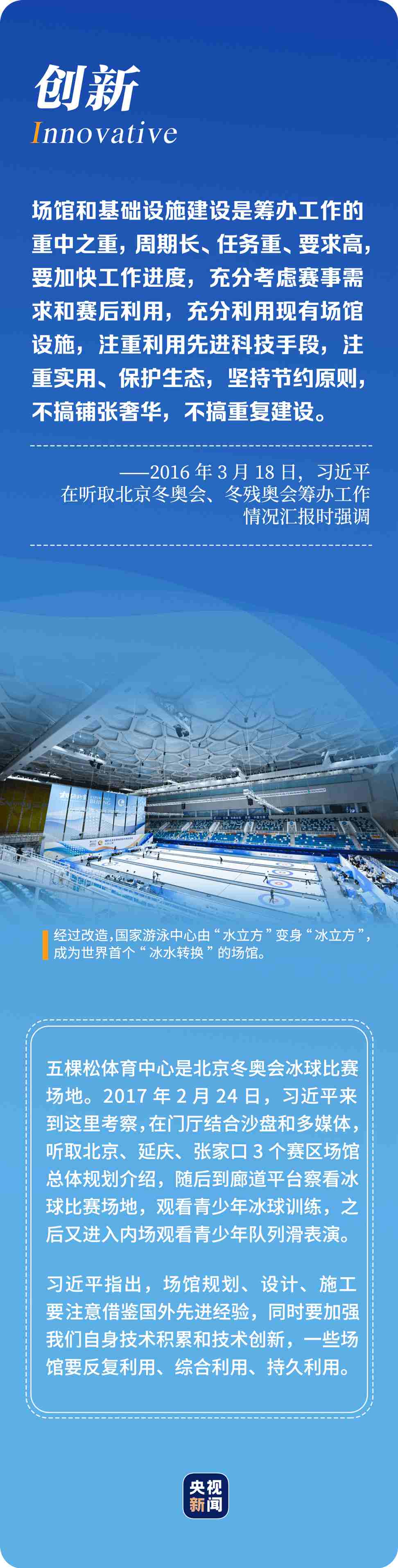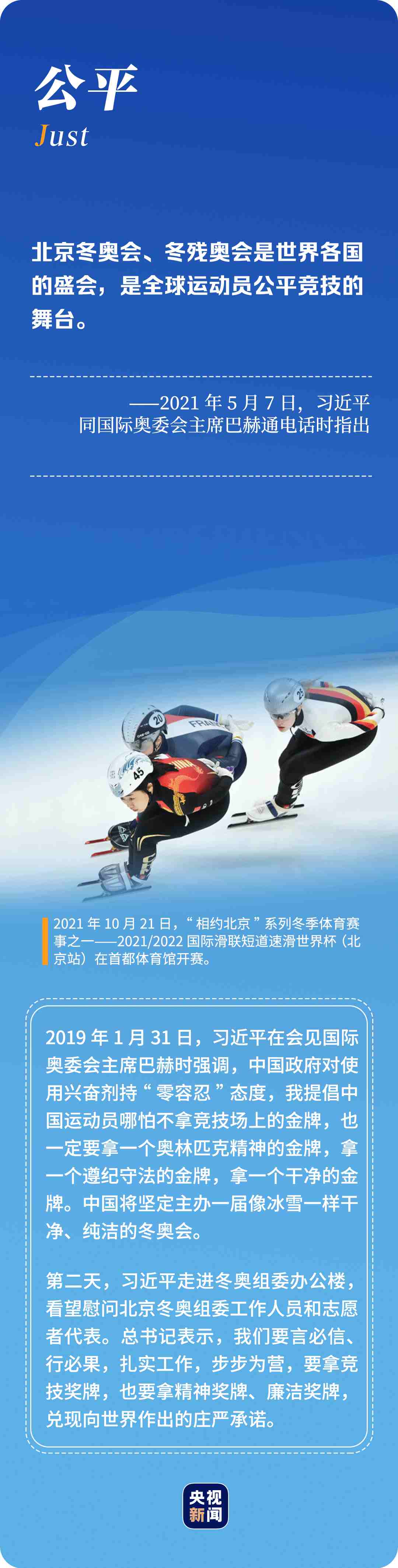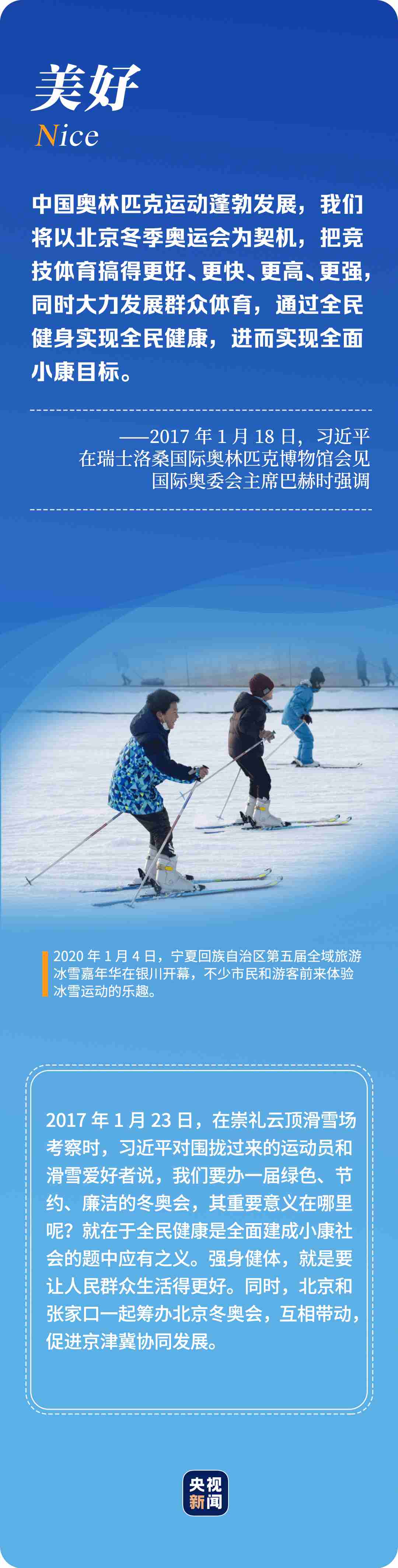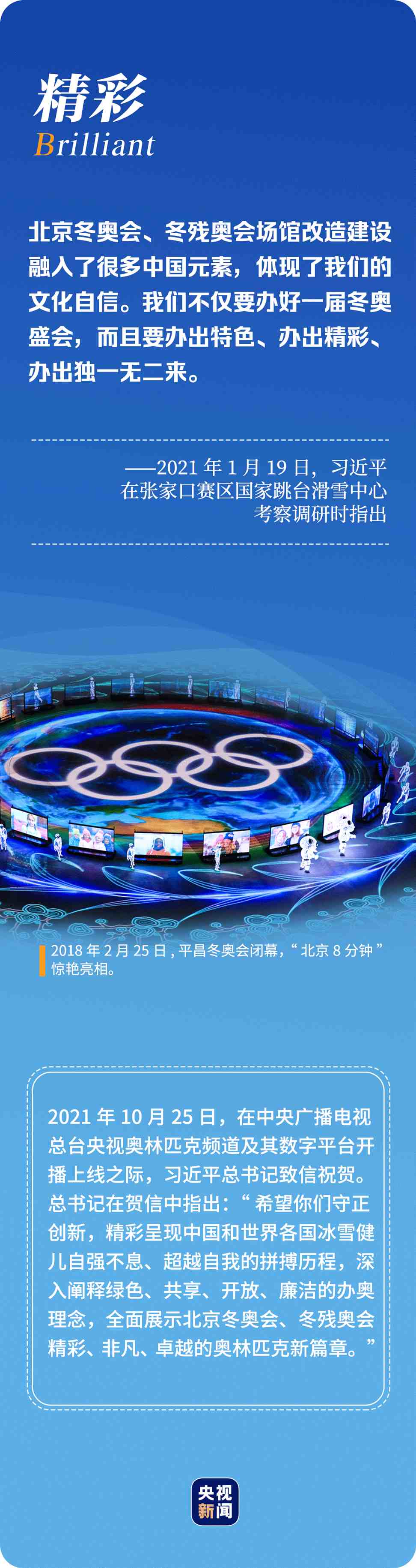 “辦好北京冬奧會(huì)、冬殘奧會(huì)是黨和國(guó)家的一件大事,是我們對(duì)國(guó)際社會(huì)的莊嚴(yán)承諾,做好北京冬奧會(huì)、冬殘奧會(huì)籌辦工作使命光榮、意義重大?!?年多來(lái),習(xí)近平總書記始終惦記著冬奧會(huì)籌辦進(jìn)展,多次實(shí)地考察、主持召開重要會(huì)議部署推進(jìn)冬奧籌辦工作。