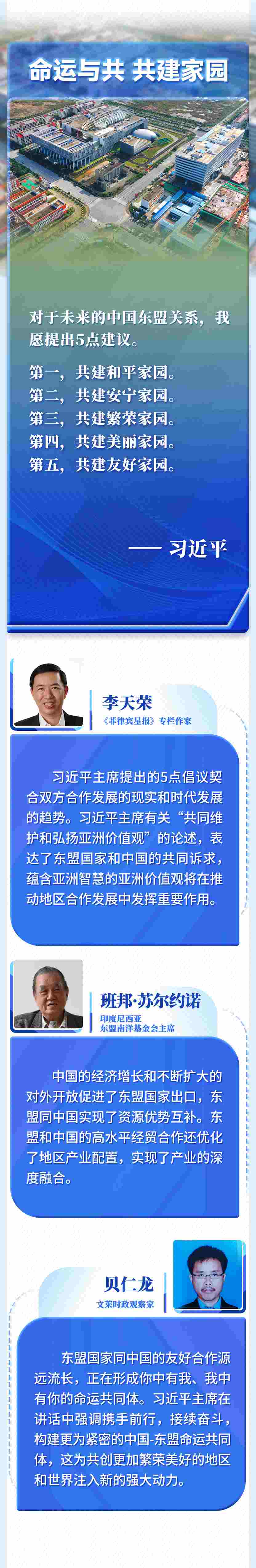 中國古人說:“謀度于義者必得,事因于民者必成。”讓我們把人民對美好生活的向往放在心頭,把維護和平、促進發(fā)展的時代使命扛在肩上,攜手前行,接續(xù)奮斗,構(gòu)建更為緊密的中國-東盟命運共同體,共創(chuàng)更加繁榮美好的地區(qū)和世界!