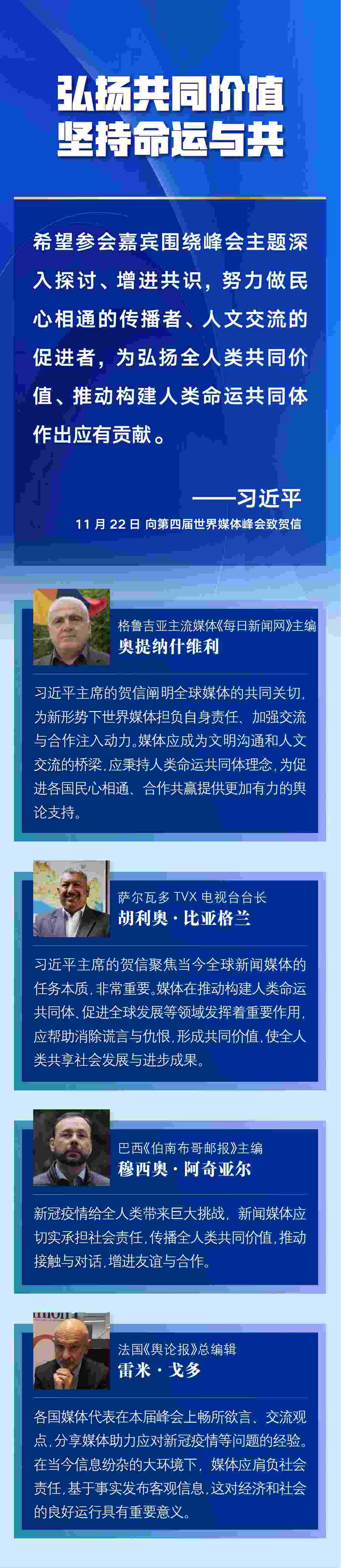 多國(guó)媒體人士認(rèn)為,習(xí)近平主席的賀信對(duì)全球媒體更好肩負(fù)社會(huì)責(zé)任、廣泛凝聚世界共識(shí)作出重要闡述,為新形勢(shì)下世界媒體加強(qiáng)交流與合作、弘揚(yáng)全人類共同價(jià)值、推動(dòng)構(gòu)建人類命運(yùn)共同體注入新的推動(dòng)力——