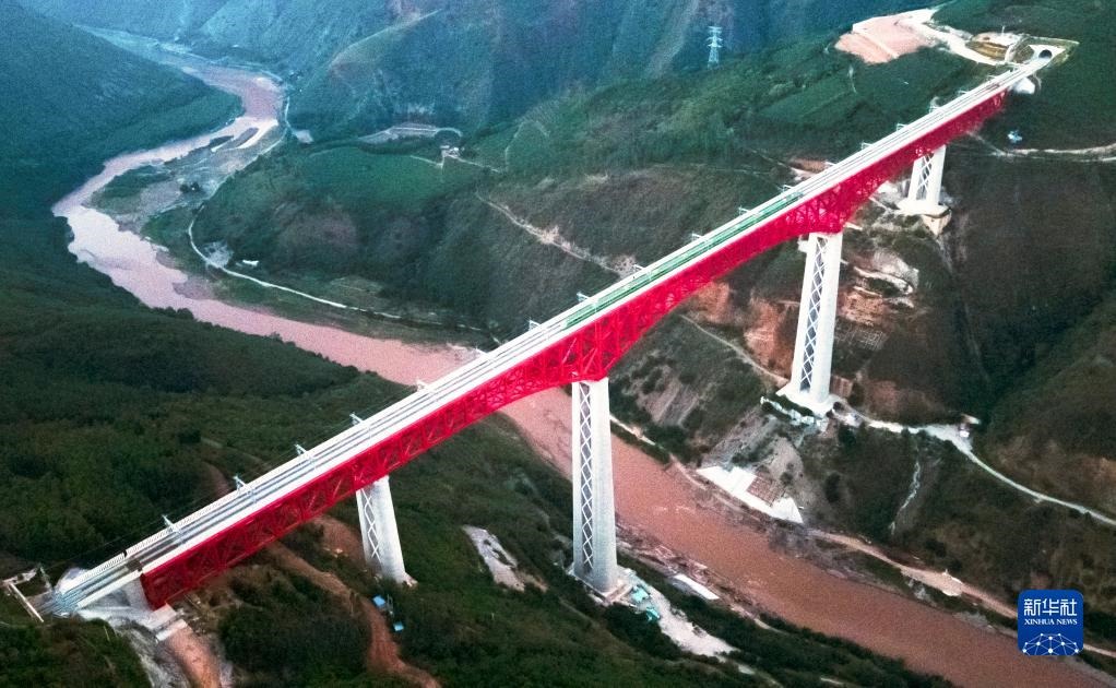 中老鐵路首發(fā)列車(chē)駛過(guò)中國(guó)云南省元江哈尼族彝族傣族自治縣境內(nèi)的元江雙線特大橋(12月3日攝,無(wú)人機(jī)照片)。新華社記者王冠森攝