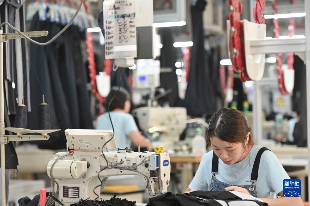 在位于福建省泉州市經(jīng)濟(jì)技術(shù)開(kāi)發(fā)區(qū)的九牧王西褲智能化生產(chǎn)車(chē)間,工人在自動(dòng)化西褲吊掛流水線上作業(yè)(7月30日攝)。新華社記者宋為偉攝