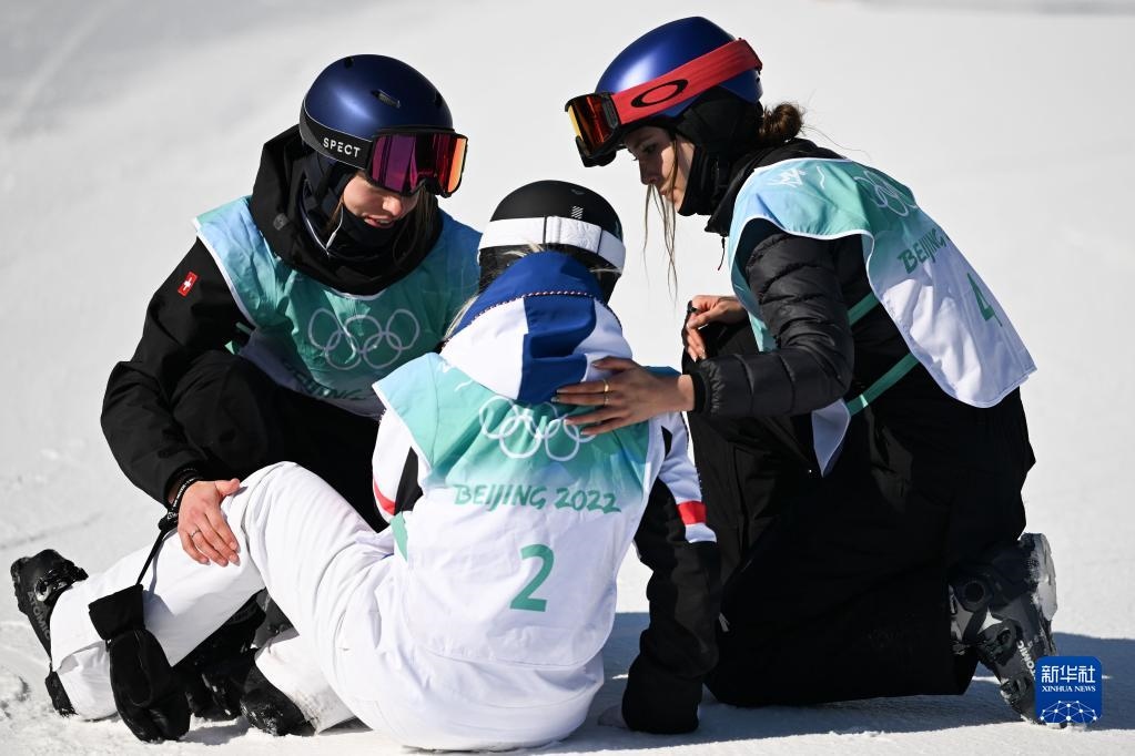 2月8日,中國選手谷愛凌(右)和瑞士選手瑪?shù)贍柕隆じ窭啄拢ㄗ螅┰谧杂墒交┡哟筇_決賽后安慰法國選手泰絲·勒德。新華社記者 薛宇舸 攝