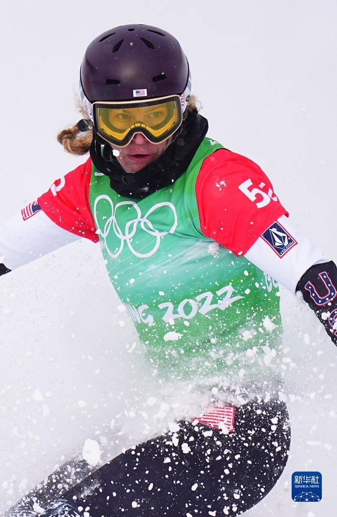 2月12日,美國選手琳賽·雅各貝利斯在比賽中。美國選手尼克·鮑姆加特納和琳賽·雅各貝利斯組成的美國一隊獲得單板滑雪障礙追逐混合團體比賽的冠軍。新華社記者 許暢 攝