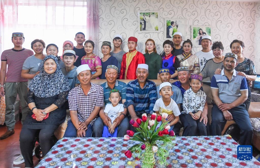 這是家住內(nèi)蒙古呼倫貝爾的夏民山(前排右三)家的家庭合影。他家由回族、漢族、蒙古族、達(dá)斡爾族、鄂溫克族、滿族共6個(gè)民族組成,45口人,三代同堂(2017年7月16日攝)。新華社記者 連振 攝