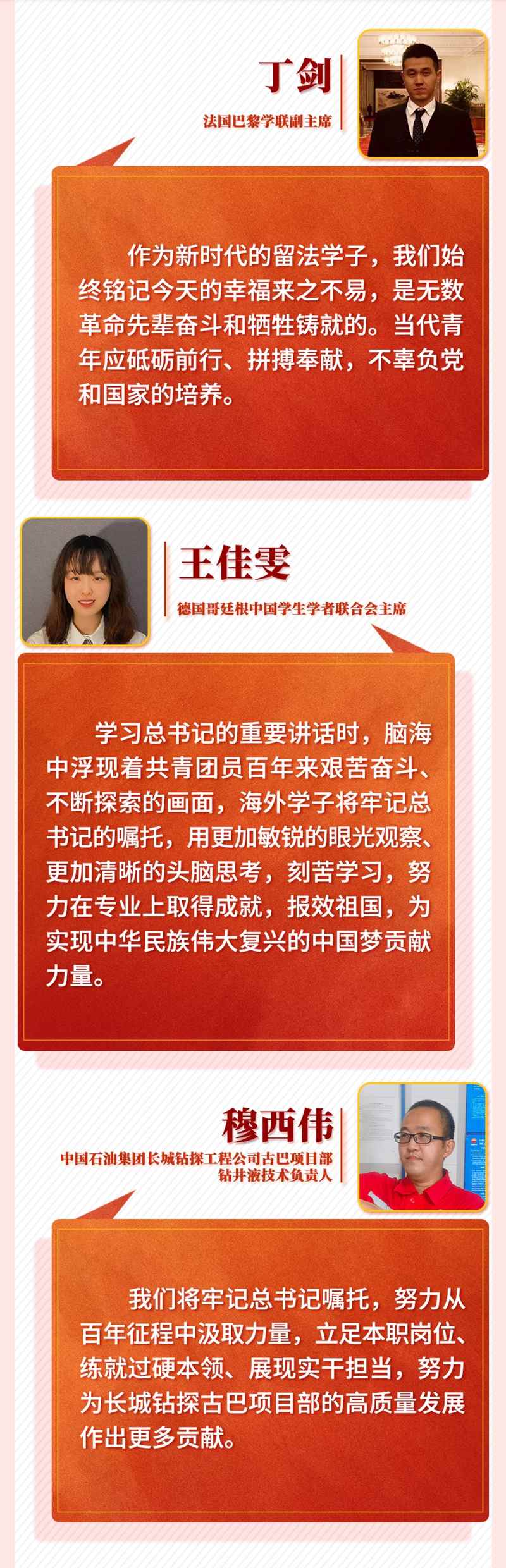 習近平總書記的重要講話令身在海外的中國青年備受鼓舞。他們一致表示,作為新時代的中國青年,一定牢記習近平總書記囑托,帶著夢想和使命,讓青春在海外煥發(fā)異彩,在實現中華民族偉大復興中國夢的新征程上奮勇前進,用青春的智慧和汗水打拼出一個更加美好的中國。