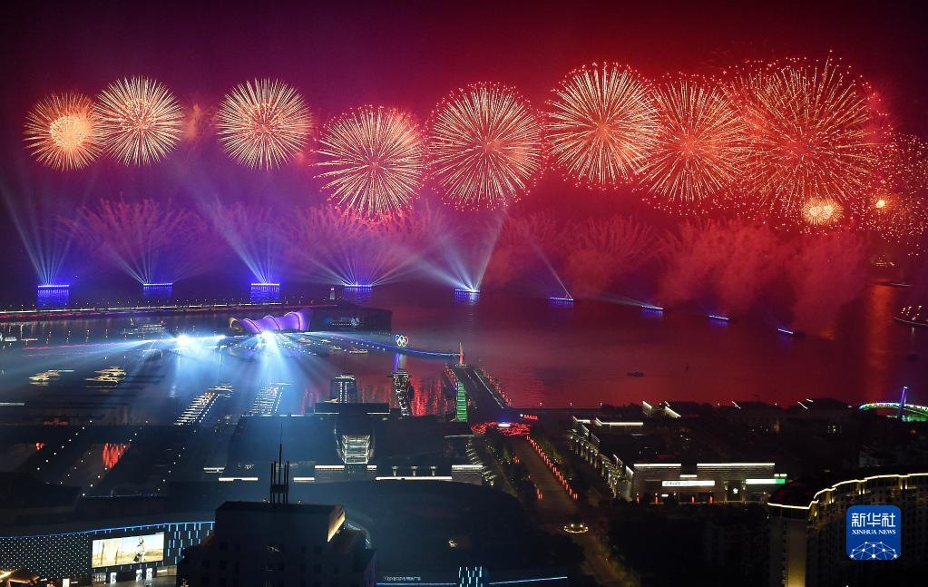 這是在青島舉行的《有朋自遠方來》燈光焰火藝術(shù)表演(2018年6月9日晚攝)。2018年6月9日至10日,上海合作組織成員國元首理事會第十八次會議在青島召開。新華社記者李紫恒攝