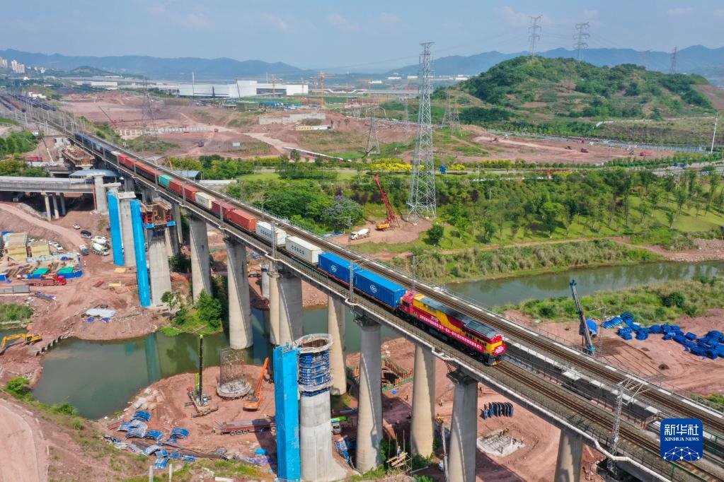 中緬新通道(重慶—臨滄—緬甸)國際鐵路班列從重慶果園港魚嘴車站順利發(fā)車(5月23日攝,無人機照片)。新華社記者 唐奕 攝