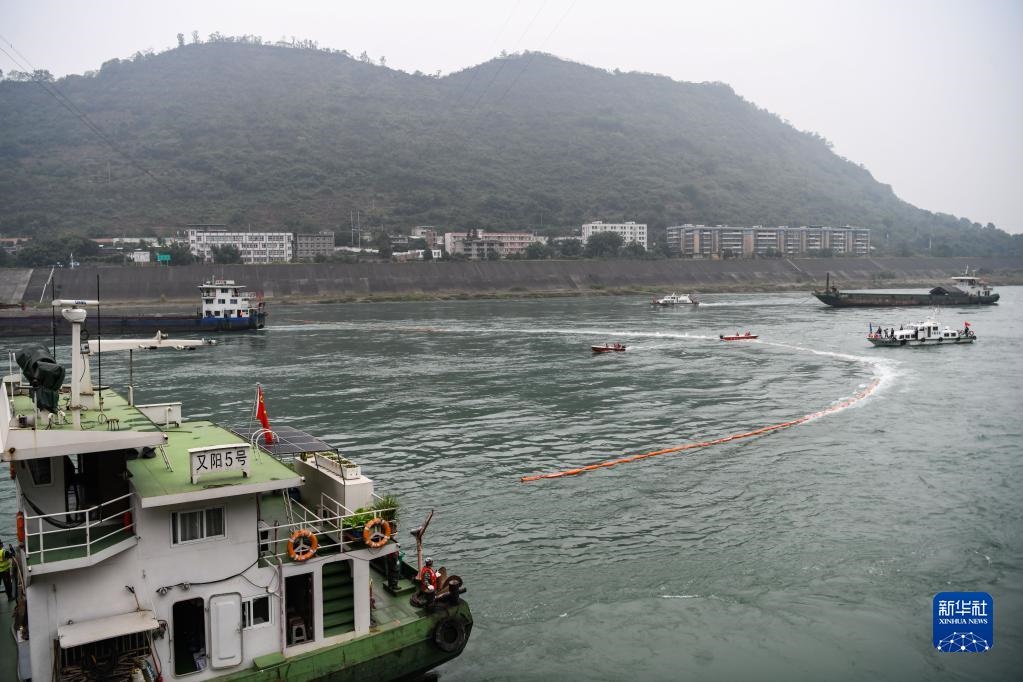 11月9日,在四川省宜賓市敘州區(qū)的長江流域突發(fā)生態(tài)環(huán)境事件應急綜合演練現場,多方部門協作在金沙江面布設圍油欄。新華社記者 王曦 攝