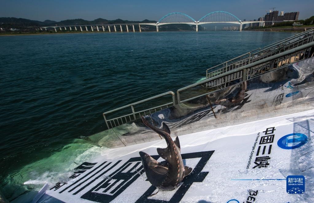 在湖北省宜昌市舉行的“2022年長江三峽中華鱘放流活動”現場,中華鱘從放流通道滑入長江(4月9日攝)。新華社發(fā)(鄭家裕 攝)