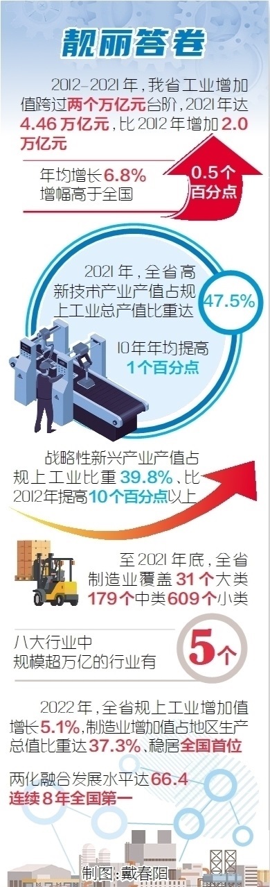 制造業(yè)規(guī)模實力保持領先。我省把制造業(yè)高質(zhì)量發(fā)展擺在更加突出位置,加快傳統(tǒng)產(chǎn)業(yè)轉(zhuǎn)型和戰(zhàn)略性新興產(chǎn)業(yè)發(fā)展,推進產(chǎn)業(yè)邁向中高端水平。工業(yè)增加值10年跨過3萬億、4萬億兩個臺階,2021年達4.46萬億元,比2012年增加2.0萬億元,年均增長6.8%,增幅高于全國0.5個百分點。