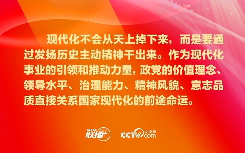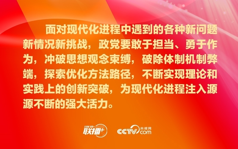 政黨要把自身建設(shè)和國家現(xiàn)代化建設(shè)緊密結(jié)合起來,踔厲奮發(fā),勇毅篤行,超越自我,確保始終有信心、有意志、有能力應(yīng)對好時代挑戰(zhàn)、回答好時代命題、呼應(yīng)好人民期盼,為不斷推進(jìn)現(xiàn)代化進(jìn)程引領(lǐng)方向、凝聚力量。