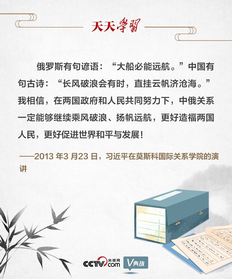 關(guān)于中俄關(guān)系,早在10年前在莫斯科國際關(guān)系學(xué)院的演講中,習(xí)近平主席就有精辟闡述。演講結(jié)束語中,習(xí)主席首先引用一句俄羅斯諺語“大船必能遠(yuǎn)航”,拉近了與俄羅斯民眾的文化空間和心理距離。接著引用了含義相近的中國古詩“長風(fēng)破浪會(huì)有時(shí),直掛云帆濟(jì)滄海”,讓對方在文化相似性中深刻領(lǐng)悟其中道理。最后凝聚共同理念:“中俄關(guān)系一定能夠繼續(xù)乘風(fēng)破浪、揚(yáng)帆遠(yuǎn)航”。