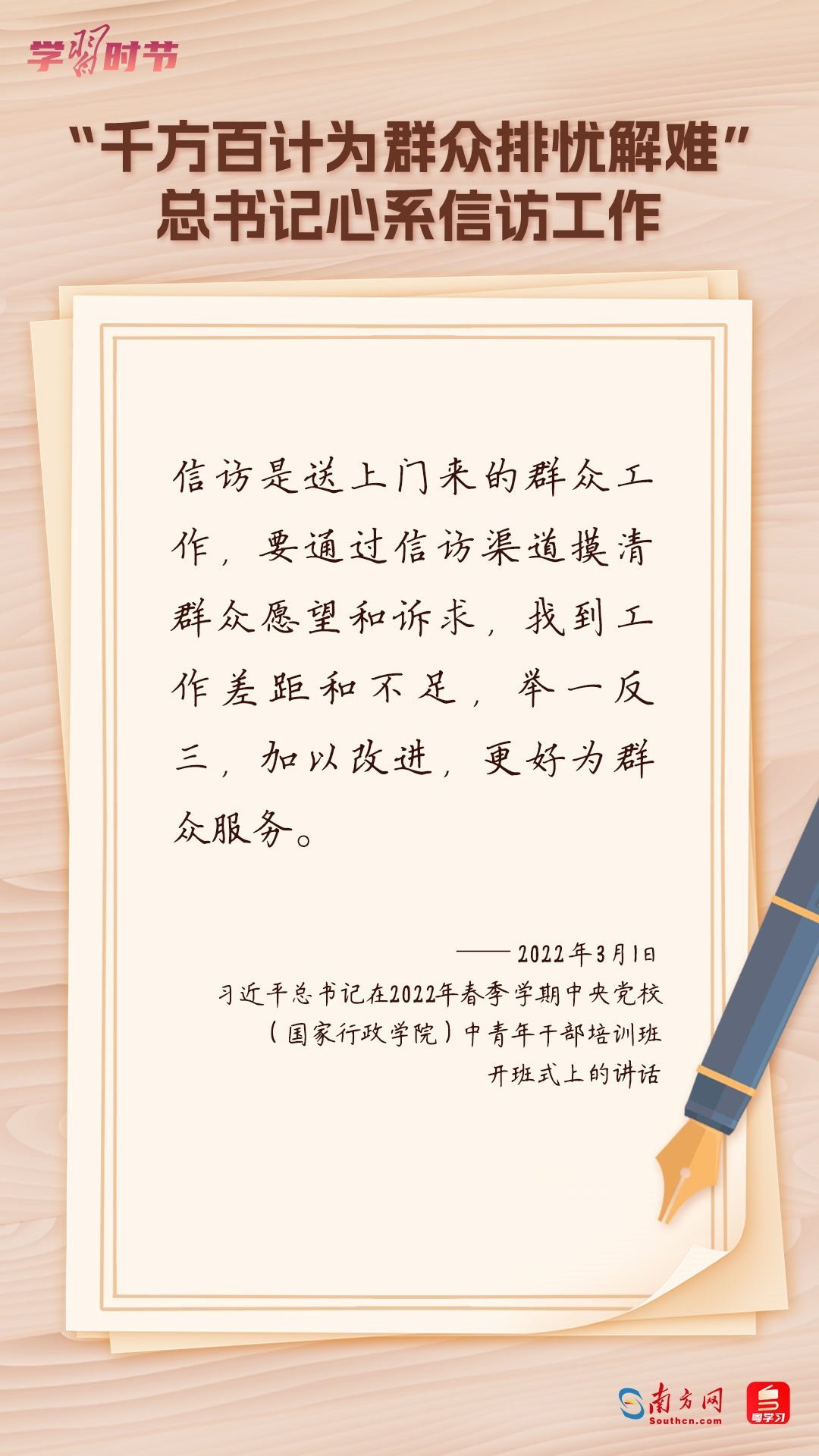 2022年5月1日,中共中央、國務(wù)院印發(fā)的《信訪工作條例》正式實(shí)施?!缎旁L工作條例》以習(xí)近平新時(shí)代中國特色社會(huì)主義思想為指導(dǎo),深入貫徹習(xí)近平總書記關(guān)于加強(qiáng)和改進(jìn)人民信訪工作的重要思想,總結(jié)黨長期以來領(lǐng)導(dǎo)和開展信訪工作經(jīng)驗(yàn)特別是黨的十八大以來信訪工作制度改革成果,堅(jiān)持和加強(qiáng)黨對(duì)信訪工作的全面領(lǐng)導(dǎo),理順信訪工作體制機(jī)制,是新時(shí)代信訪工作的基本遵循。今年5月1日是《信訪工作條例》實(shí)施一周年,“學(xué)習(xí)時(shí)節(jié)”整理摘錄習(xí)近平總書記關(guān)于信訪工作的重要講話和重要指示批示,與您一同學(xué)習(xí)。
