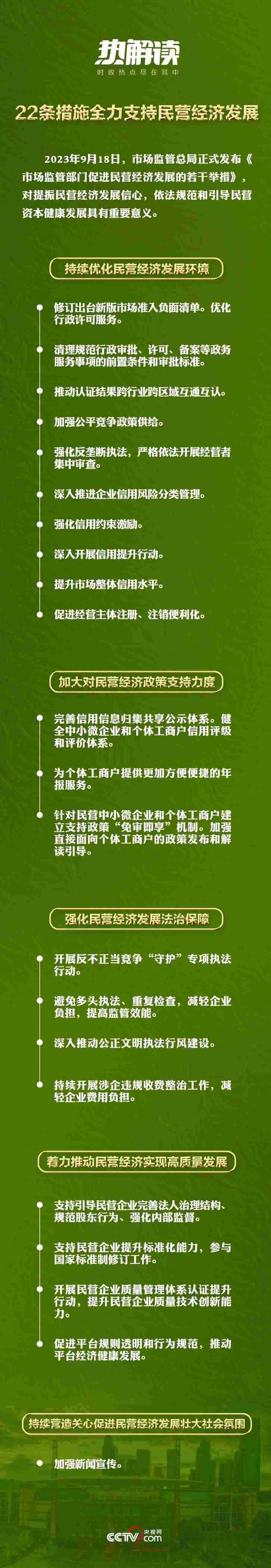 2023年7月14日,中共中央國務(wù)院出臺《關(guān)于促進(jìn)民營經(jīng)濟(jì)發(fā)展壯大的意見》,對促進(jìn)民營經(jīng)濟(jì)發(fā)展壯大作出新的重大部署。2023年9月18日,市場監(jiān)管總局發(fā)布《市場監(jiān)管部門促進(jìn)民營經(jīng)濟(jì)發(fā)展的若干舉措》,通過22條措施為全力支持民營經(jīng)濟(jì)發(fā)展設(shè)計(jì)了具體落實(shí)的“施工圖”。