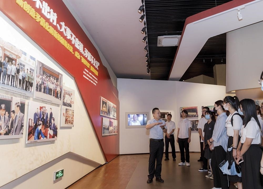 青年學(xué)子在浙江省諸暨市楓橋鎮(zhèn)的楓橋經(jīng)驗(yàn)陳列館參觀學(xué)習(xí)(2022年8月25日攝)。新華社記者 徐昱 攝