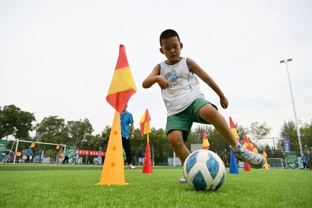 △2023年8月6日,一位小朋友在寧夏全民健身日主題示范系列活動(dòng)現(xiàn)場(chǎng)體驗(yàn)趣味足球。