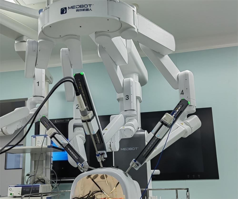 患子宮肌瘤合并貧血的王女士近日在銀川一家醫(yī)院接受了全子宮切除微創(chuàng)手術。解剖、分離、切割、縫合等各項精細手術動作都由機器人的4條機械臂操作。