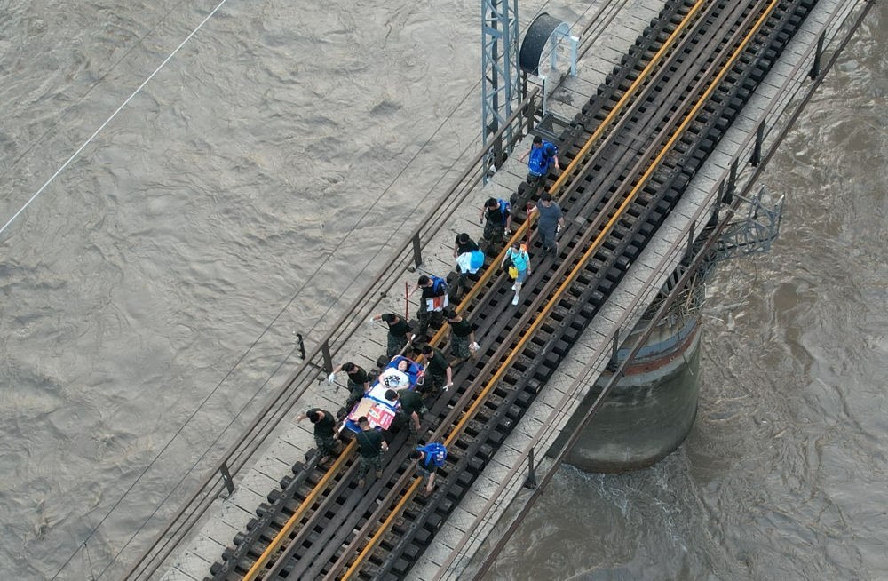8月6日,在吉林省舒蘭市開原鎮(zhèn)新開村被洪水沖毀的斷橋上,吉林市消防救援支隊隊員利用繩橋解救受困村民。