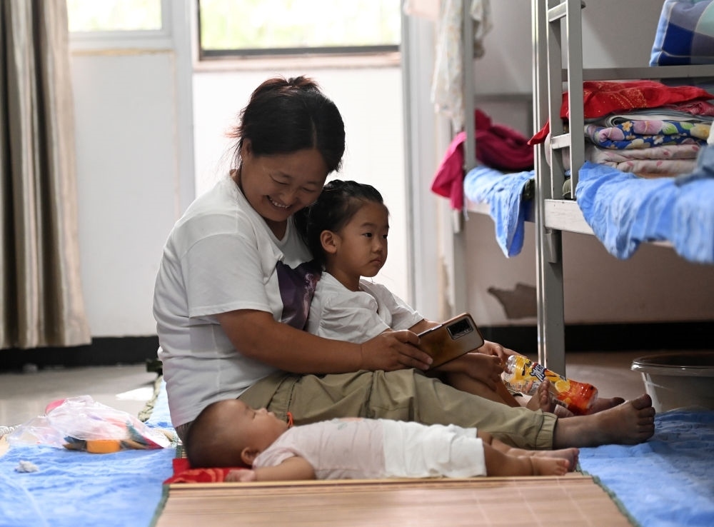 8月12日,在天津市靜海區(qū)大邱莊中學集中安置點,轉(zhuǎn)移群眾在宿舍內(nèi)照看孩子。