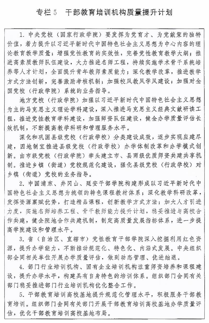 (一)培訓(xùn)機(jī)構(gòu)建設(shè)。推進(jìn)各級(jí)黨校(行政學(xué)院)建設(shè),以教學(xué)督導(dǎo)、師資培養(yǎng)、質(zhì)量評(píng)估為重點(diǎn),強(qiáng)化上級(jí)黨校(行政學(xué)院)對(duì)下級(jí)黨校(行政學(xué)院)的業(yè)務(wù)指導(dǎo),不斷提高辦學(xué)水平。推進(jìn)縣級(jí)黨校(行政學(xué)校)分類建設(shè)。加強(qiáng)社會(huì)主義學(xué)院建設(shè)。進(jìn)一步提升部門行業(yè)培訓(xùn)機(jī)構(gòu)、國(guó)有企業(yè)培訓(xùn)機(jī)構(gòu)辦學(xué)質(zhì)量。加強(qiáng)對(duì)干部教育培訓(xùn)高?;?、基層干部教育培訓(xùn)機(jī)構(gòu)辦學(xué)指導(dǎo)。開(kāi)展黨校(行政學(xué)院)、?。ㄗ灾螀^(qū)、直轄市)黨性教育干部學(xué)院、干部教育培訓(xùn)高?;剞k學(xué)質(zhì)量評(píng)估。加強(qiáng)各類黨員干部教育培訓(xùn)機(jī)構(gòu)規(guī)范管理,嚴(yán)控新設(shè)以黨員干部為培訓(xùn)對(duì)象的培訓(xùn)機(jī)構(gòu)。支持地方、部門聯(lián)合開(kāi)展培訓(xùn),鼓勵(lì)干部教育培訓(xùn)機(jī)構(gòu)開(kāi)展區(qū)域協(xié)作交流,推動(dòng)優(yōu)質(zhì)培訓(xùn)資源共享。實(shí)施干部教育培訓(xùn)機(jī)構(gòu)質(zhì)量提升計(jì)劃(專欄5)。