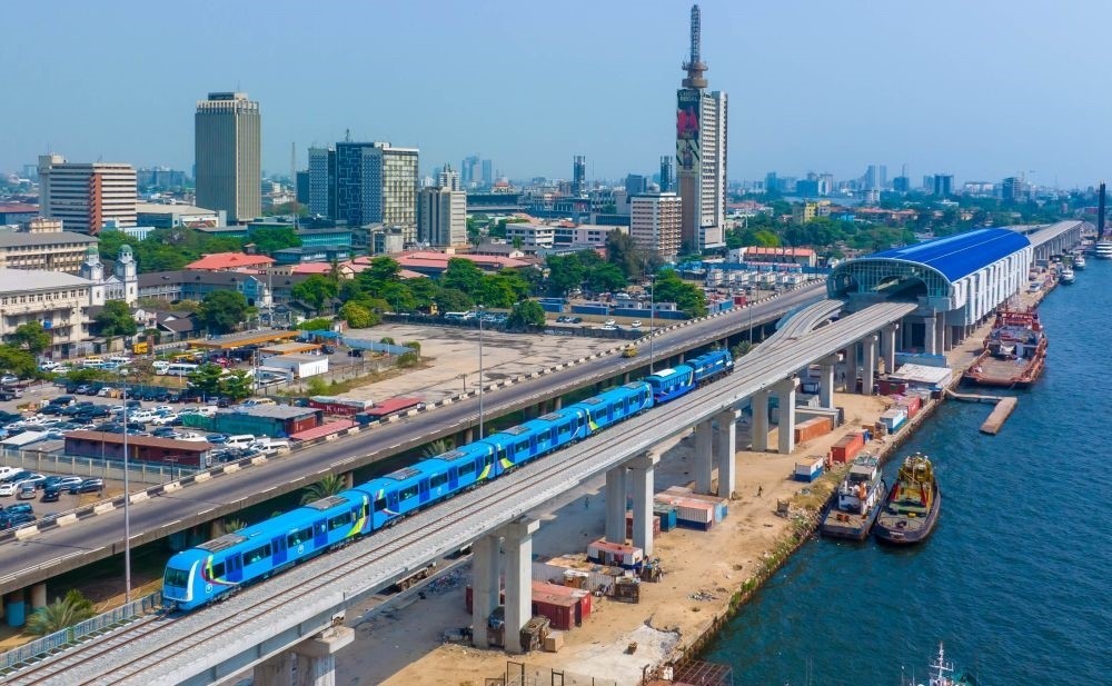 這是尼日利亞拉各斯輕軌藍(lán)線上的一列輕軌列車(2022年12月21日攝,無(wú)人機(jī)照片)。新華社發(fā)(托普·阿尤庫(kù)攝)
