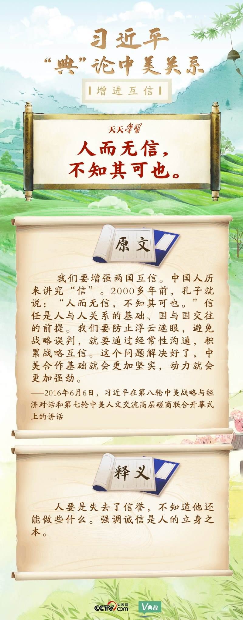 黨的十八大以來,習(xí)近平主席就中美關(guān)系發(fā)表了一系列重要講話。他站在時(shí)代高度分析、研判中美關(guān)系現(xiàn)狀及發(fā)展趨勢,并引經(jīng)據(jù)典為發(fā)展中美關(guān)系指出正確方向。這些論述蘊(yùn)含深刻的戰(zhàn)略思維和政治智慧,具有重大現(xiàn)實(shí)意義和深遠(yuǎn)歷史意義。央視網(wǎng)《天天學(xué)習(xí)》與您一起深刻領(lǐng)會(huì)。