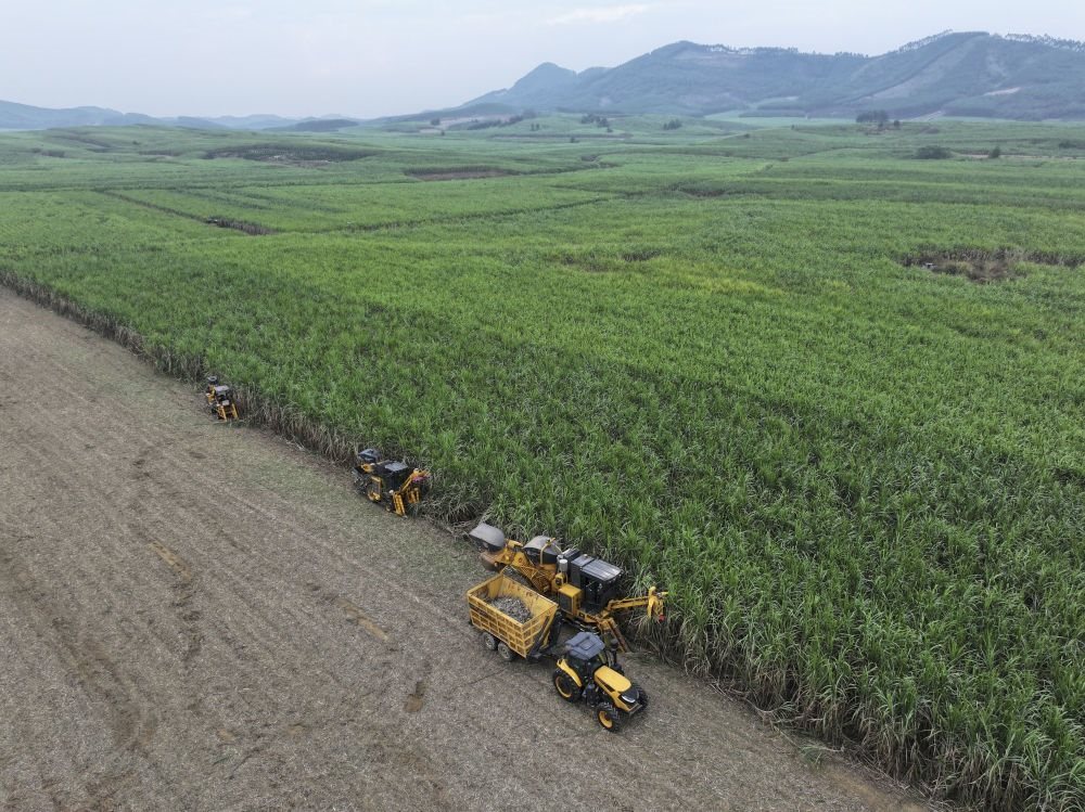 2023年12月12日,在廣西來賓市興賓區(qū)小平陽鎮(zhèn),農(nóng)民在收割甘蔗(無人機(jī)照片)。新華社記者 周華 攝