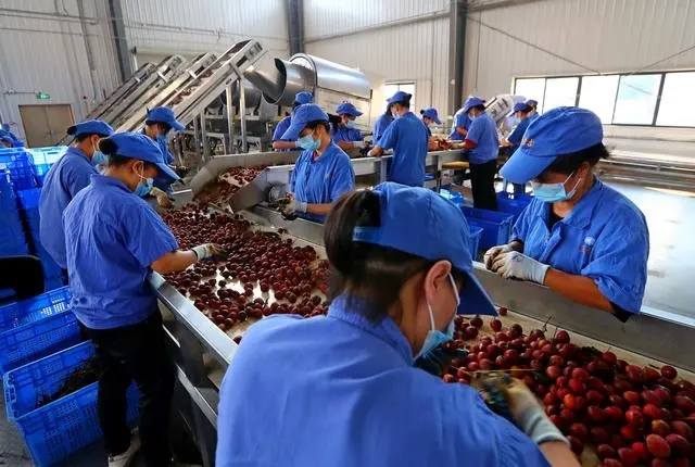 △工人們?cè)趶V東茂名一荔枝產(chǎn)業(yè)園生產(chǎn)車間工作。這里的荔枝清汁生產(chǎn)線每天可處理200噸荔枝鮮果。