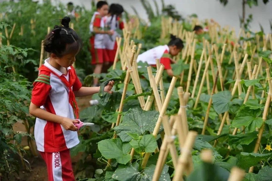 △今年6月,育英學(xué)校小農(nóng)場(chǎng)迎來(lái)豐收,同學(xué)們?cè)诓烧卟恕?/span>