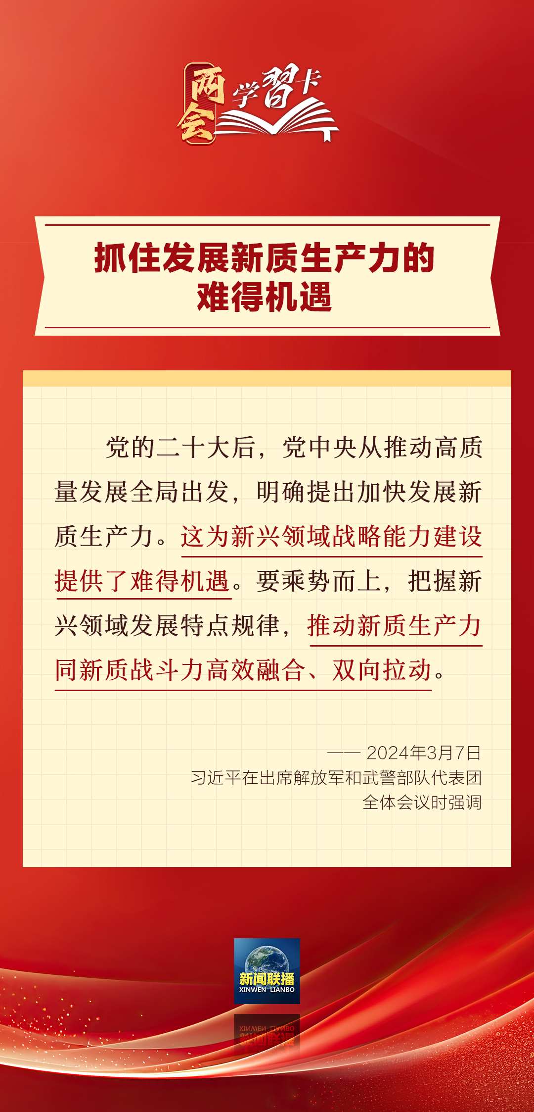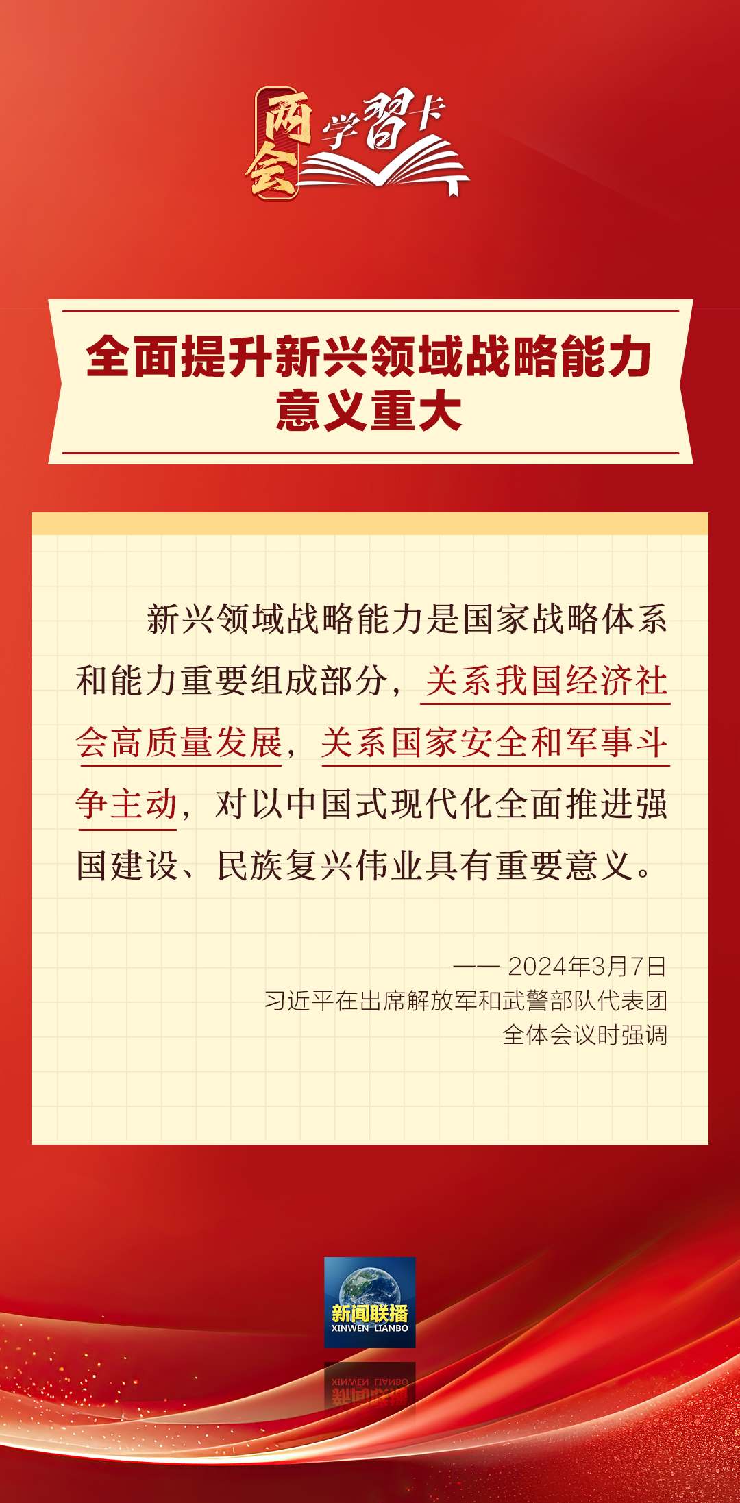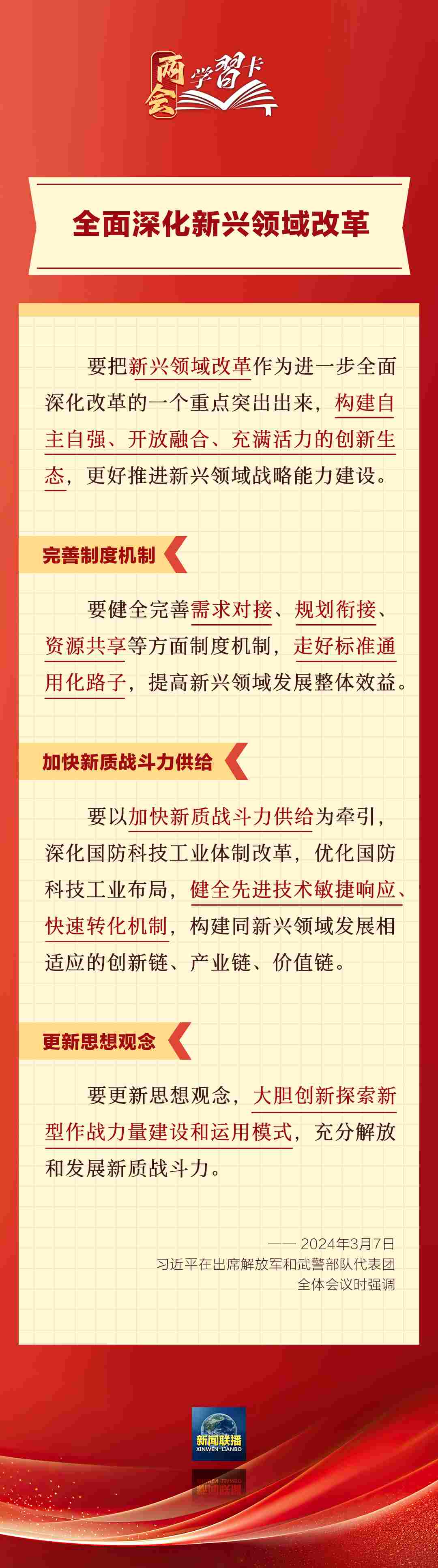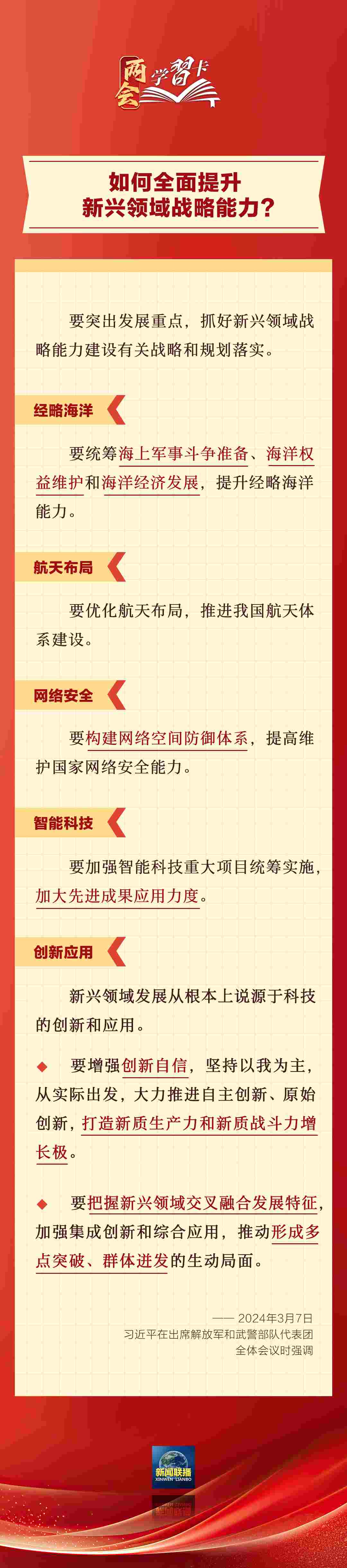 3月7日,習(xí)近平在出席解放軍和武警部隊代表團(tuán)全體會議時強(qiáng)調(diào),強(qiáng)化使命擔(dān)當(dāng),深化改革創(chuàng)新,全面提升新興領(lǐng)域戰(zhàn)略能力。如何提升新興領(lǐng)域戰(zhàn)略能力?一起學(xué)習(xí)↓↓↓