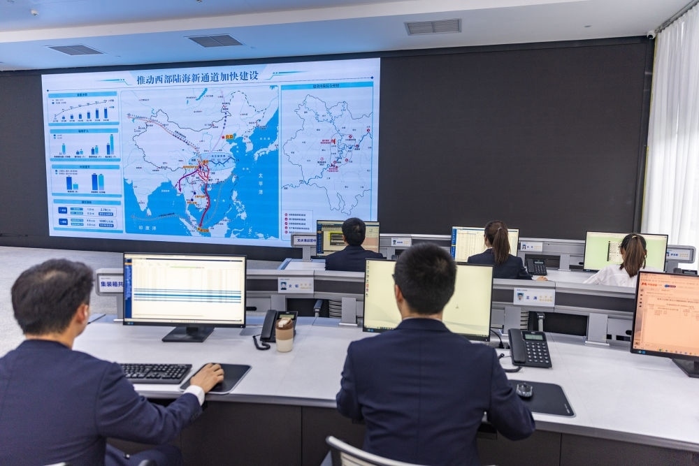 2024年4月22日,工作人員在西部陸海新通道運營調度中心工作。工作人員可以在大屏上實時了解班列在邊境口岸的出入境信息。