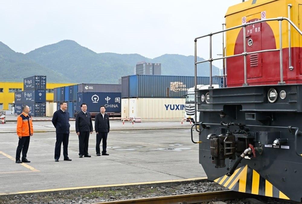 這是4月22日,習近平在重慶國際物流樞紐園區(qū),了解當?shù)丶涌旖ㄔO西部陸海新通道等情況。