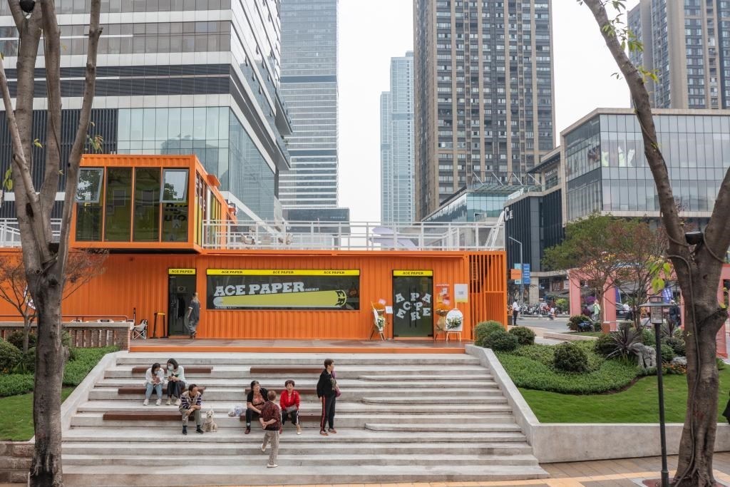 2023年4月28日,在竣工亮相的民主村片區(qū)城市更新項目(一期),人們在一處公共空間休息(無人機照片)。