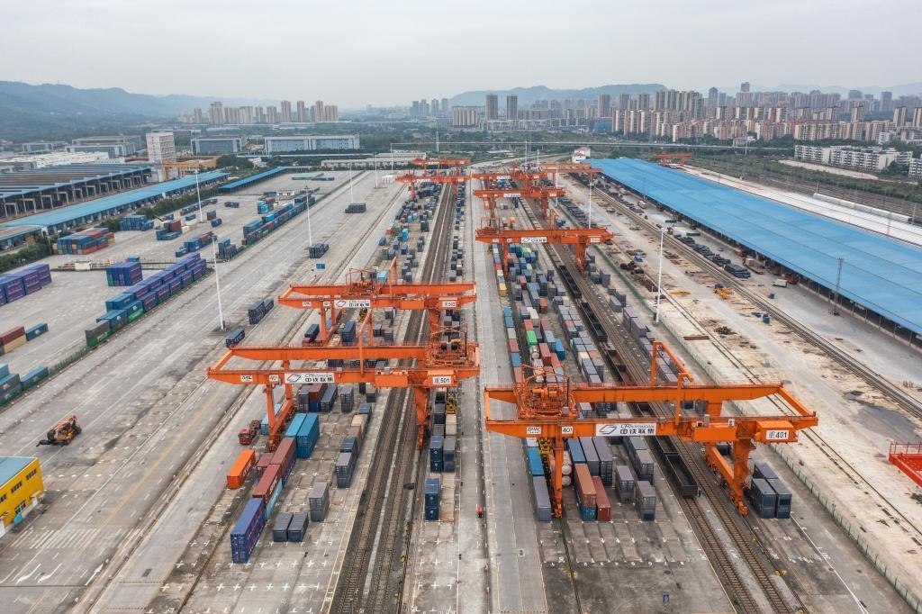 如今,“四向”物流通道在這里交匯:向西,中歐班列直達(dá)歐洲多國(guó);向東,渝甬班列直抵寧波舟山港;向北,“渝滿俄”班列開行;向南,西部陸海新通道直達(dá)廣西欽州港,再通往世界多個(gè)國(guó)家和地區(qū)……