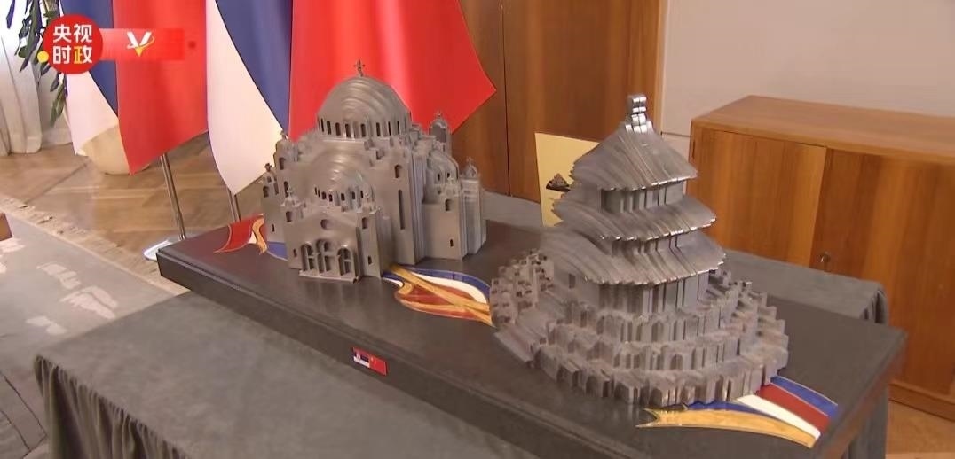 這份禮物是北京天壇和貝爾格萊德圣薩瓦教堂造型的鋼制工藝品,由中國河鋼集團斯梅戴雷沃鋼廠生產(chǎn)的鋼材制成。望著這份禮物,習主席風趣地說,是“鋼桿”朋友了。