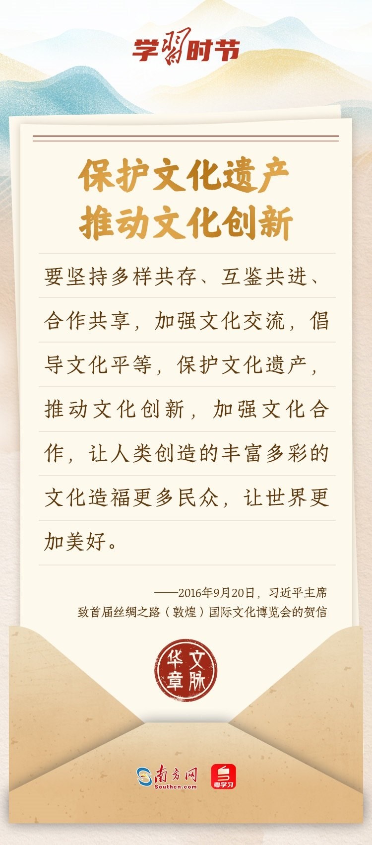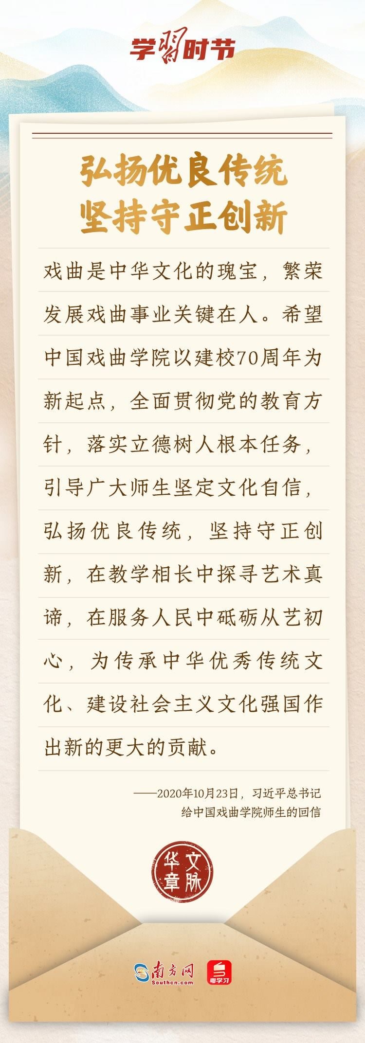 “中華民族在幾千年歷史中創(chuàng)造和延續(xù)的中華優(yōu)秀傳統(tǒng)文化,是中華民族的根和魂。”習(xí)近平總書記多次通過發(fā)賀信、寫回信等方式,表達著對弘揚中華優(yōu)秀傳統(tǒng)文化的殷切希望,飽含深情、字字暖心、催人奮進。讓我們一起“讀”信。