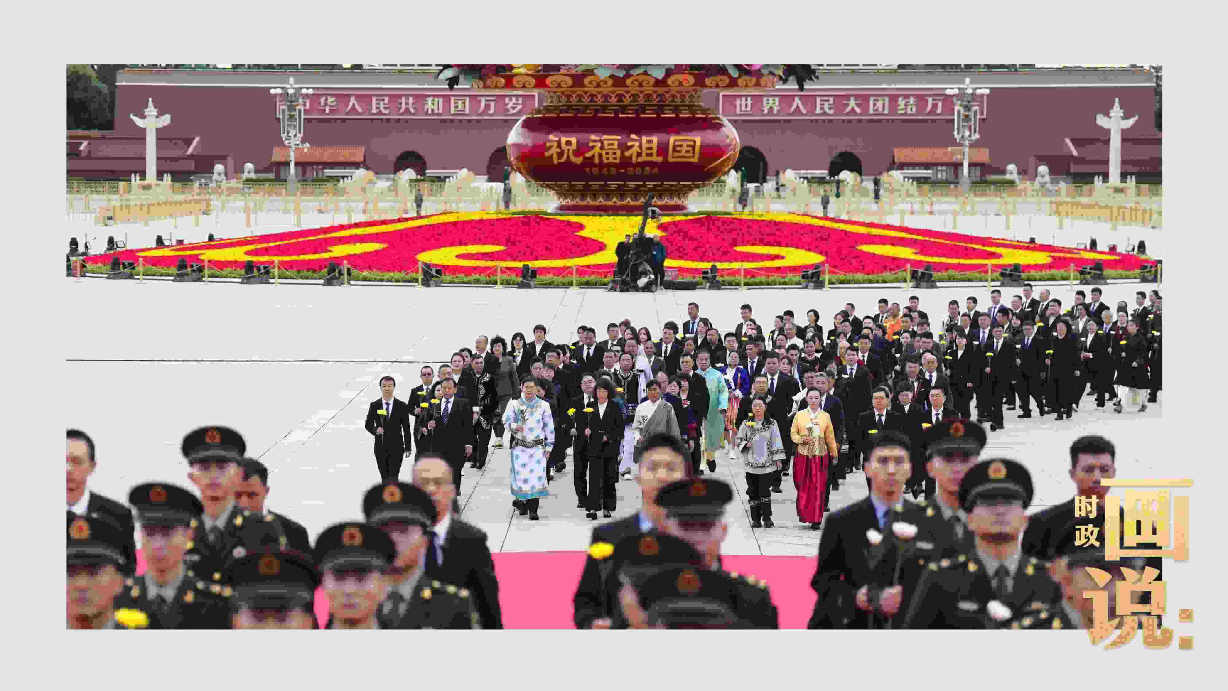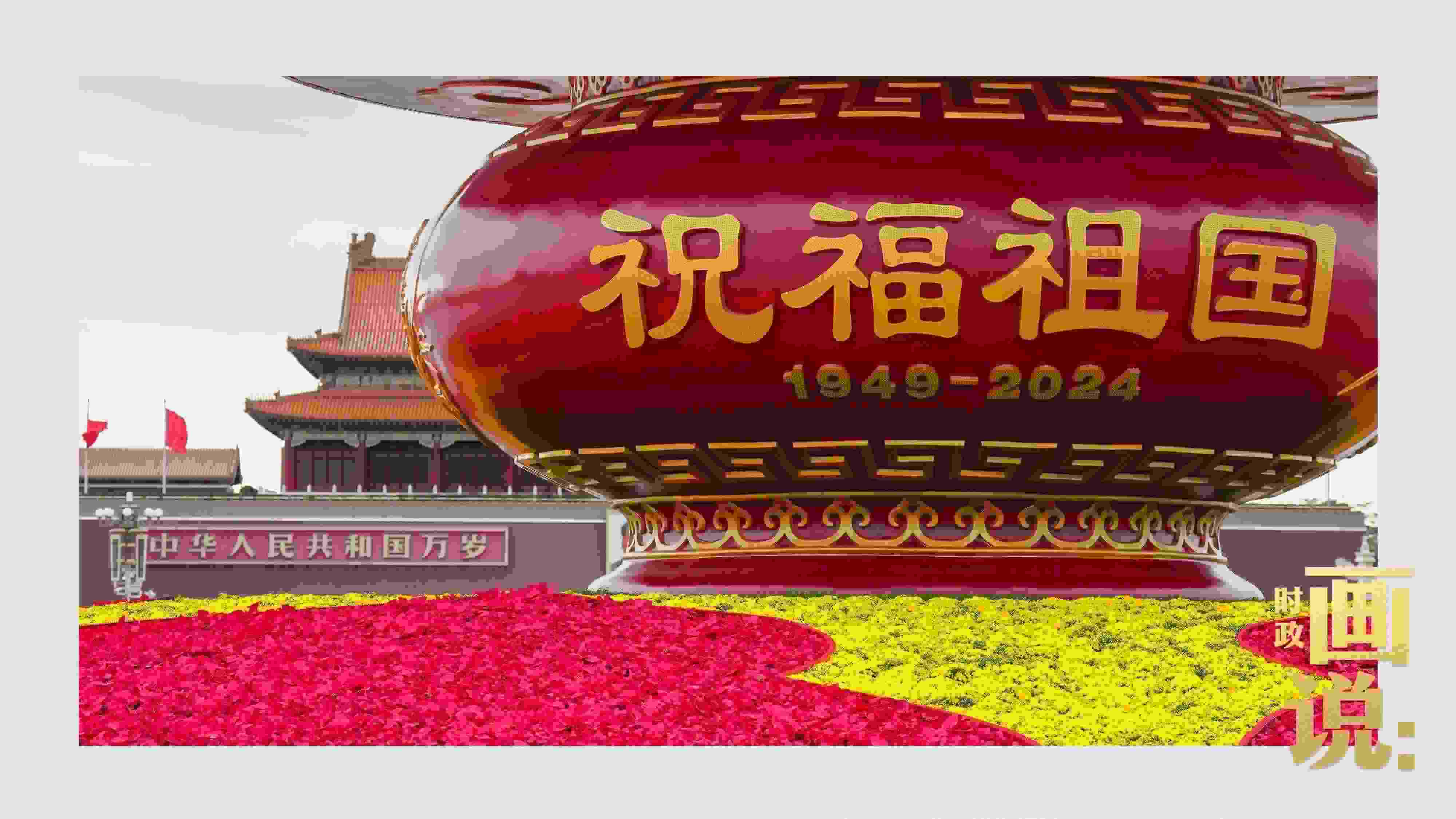 △天安門廣場(chǎng)中央,“祝福祖國(guó)”巨型花籃表達(dá)著對(duì)國(guó)家繁榮富強(qiáng)的美好祝福。