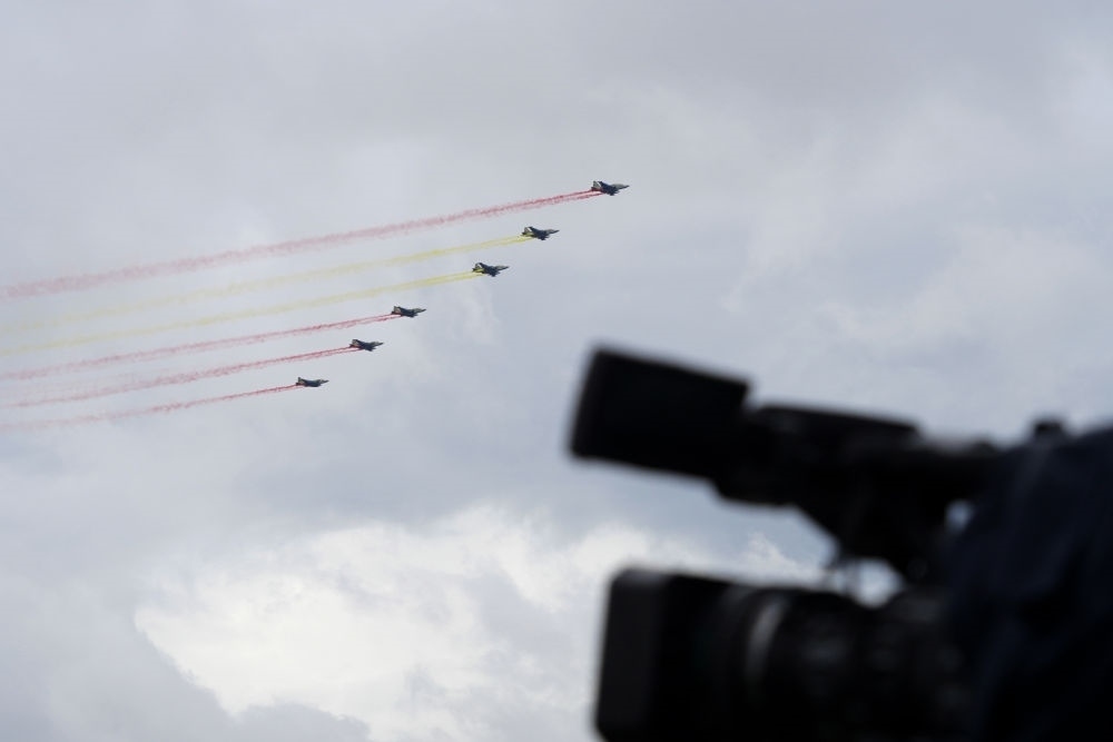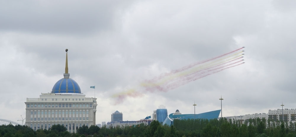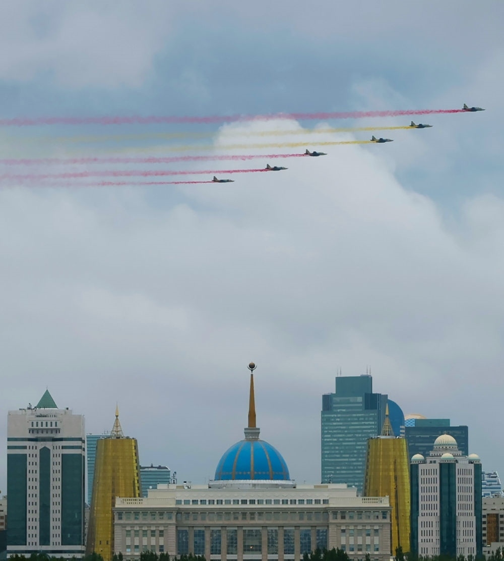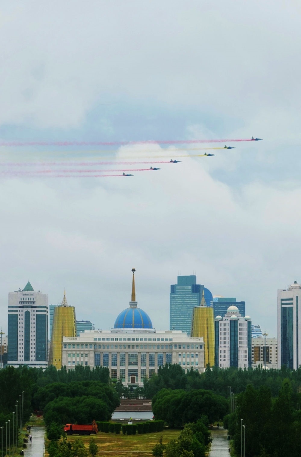 習近平主席抵達時,哈方多架戰(zhàn)機在總統(tǒng)府上空拉出中國國旗色彩煙歡迎中國貴賓。
