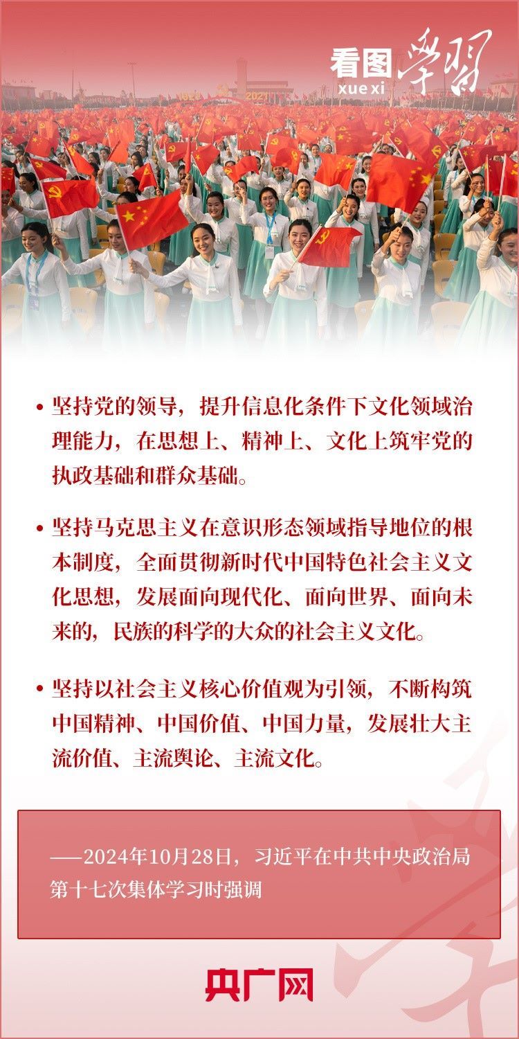 建設(shè)文化強(qiáng)國(guó)是全黨全社會(huì)的共同任務(wù)。10月28日,中共中央政治局就建設(shè)文化強(qiáng)國(guó)進(jìn)行第十七次集體學(xué)習(xí)。習(xí)近平總書(shū)記在聽(tīng)取講解和討論后發(fā)表重要講話,就錨定2035年建成文化強(qiáng)國(guó)戰(zhàn)略目標(biāo)作出最新部署,強(qiáng)調(diào)要“不斷發(fā)展具有強(qiáng)大思想引領(lǐng)力、精神凝聚力、價(jià)值感召力、國(guó)際影響力的新時(shí)代中國(guó)特色社會(huì)主義文化,不斷增強(qiáng)人民精神力量,筑牢強(qiáng)國(guó)建設(shè)、民族復(fù)興的文化根基。”一起來(lái)學(xué)習(xí)!
