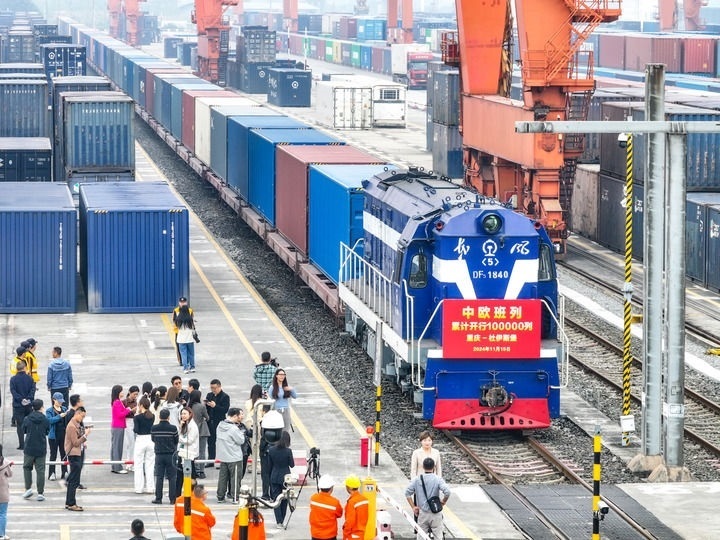 11月15日上午10時(shí)20分,重慶團(tuán)結(jié)村中心站。隨著X8083次中歐班列(重慶—杜伊斯堡)從站臺緩緩駛出,中歐班列累計(jì)開行突破10萬列。