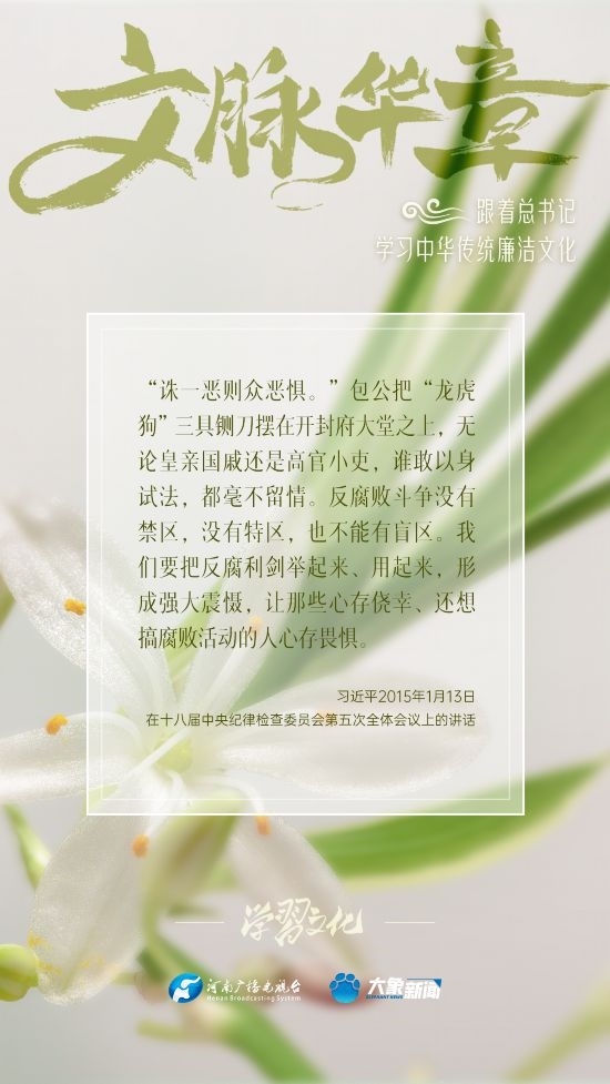 中華優(yōu)秀傳統(tǒng)文化蘊(yùn)含著豐富的廉潔文化,習(xí)近平總書(shū)記曾指出:沒(méi)有中華優(yōu)秀傳統(tǒng)文化、革命文化、社會(huì)主義先進(jìn)文化的底蘊(yùn)和滋養(yǎng),信仰信念就難以深沉而執(zhí)著。總書(shū)記常常引經(jīng)據(jù)典,教育引導(dǎo)廣大黨員干部正心修身,涵養(yǎng)文化,守住為政之本。大象新聞分五期為您梳理,我們一起跟著總書(shū)記學(xué)習(xí)中華傳統(tǒng)廉潔文化。今天推出第五期。