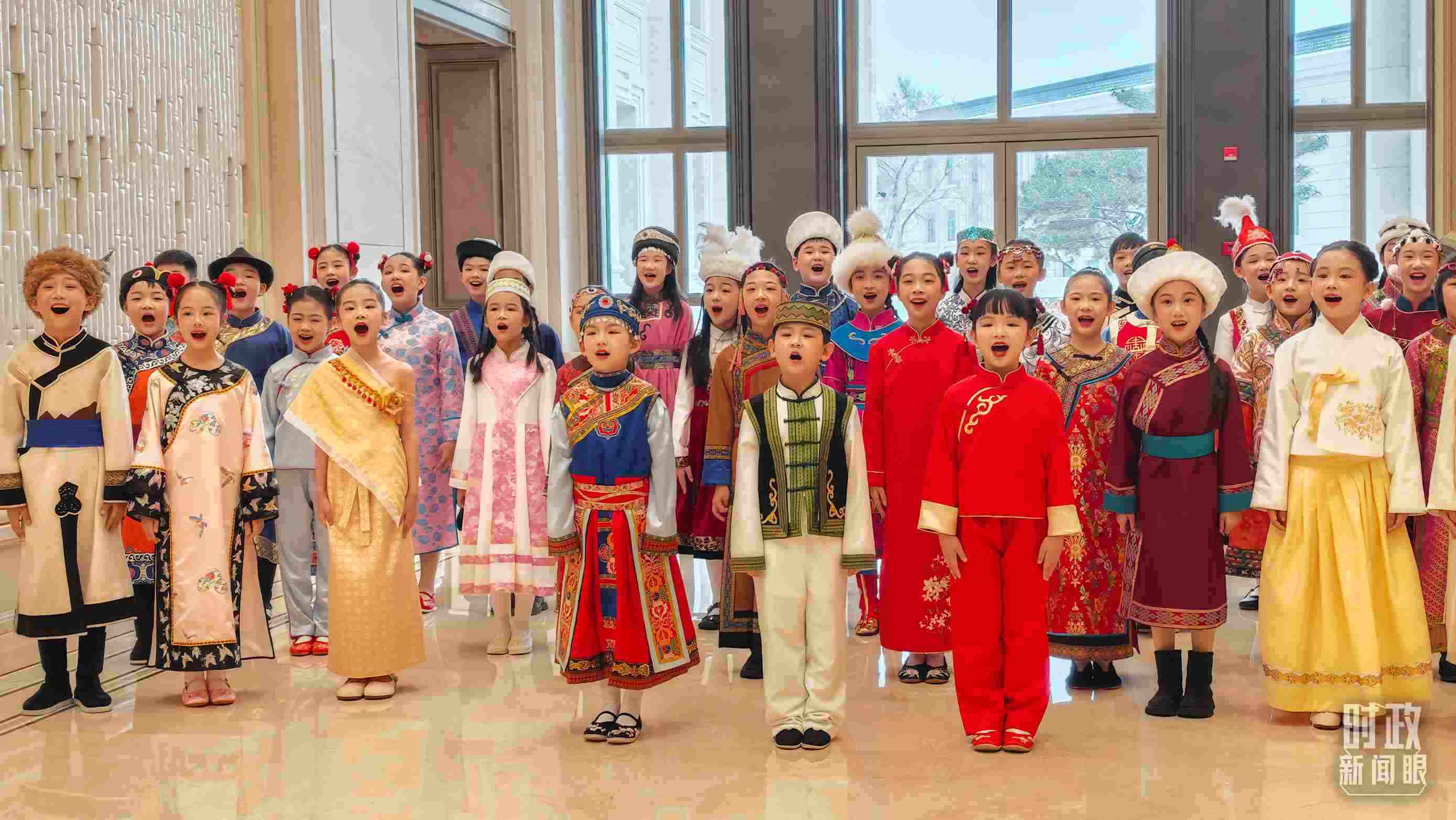 △歡迎宴會現(xiàn)場,少年兒童正在合唱黑龍江民歌《烏蘇里船歌》。(總臺央視記者閆耀東拍攝)