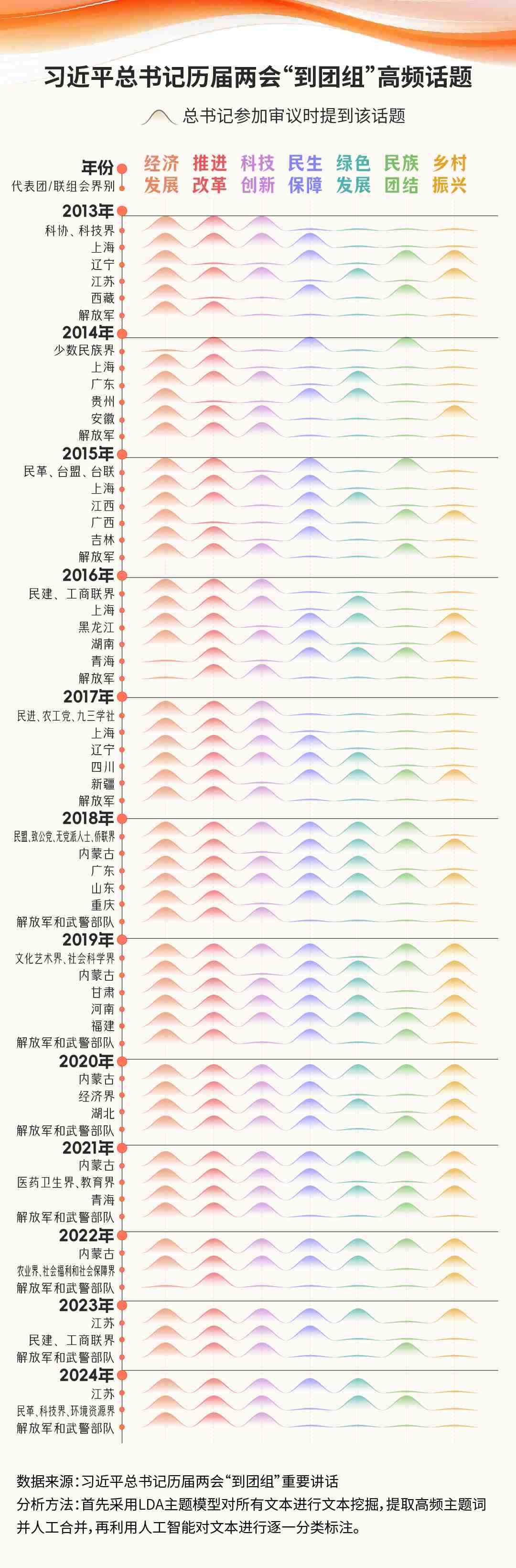 習近平總書記最經(jīng)常去哪些團組?從數(shù)據(jù)分析結果來看,總書記心系軍隊建設,1212次到訪解放軍/解放軍和武警部隊代表團,每年“到團組”的最后一站都是參加軍隊代表團的審議。