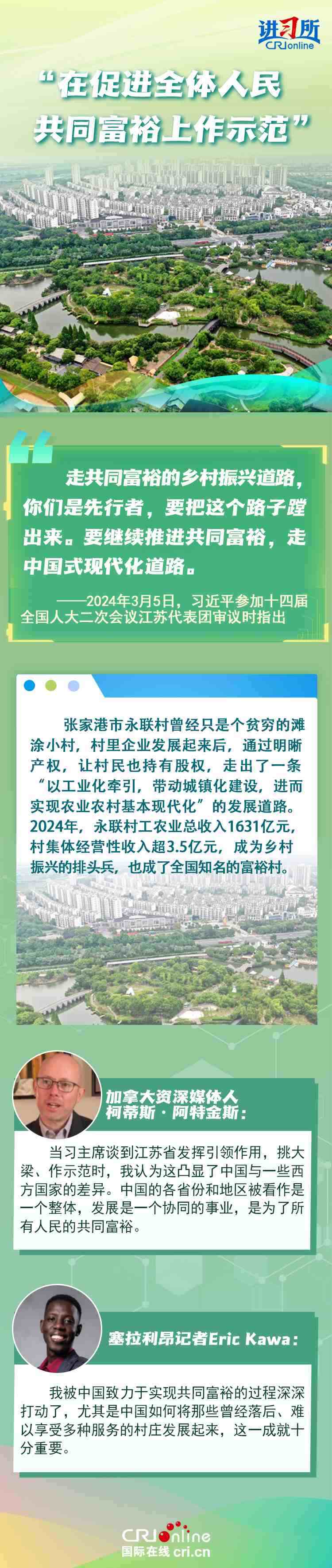 從紫金山實驗室的6G突破到蘇州工業(yè)園區(qū)的開放升級,從長三角協(xié)同創(chuàng)新到永聯(lián)村的共富實踐,江蘇在中國式現(xiàn)代化新實踐上已成為世界觀察中國高質(zhì)量發(fā)展的重要窗口。國際人士認(rèn)為,中國因地制宜的創(chuàng)新發(fā)展之路有力推動了國家現(xiàn)代化進程與民生福祉提升。