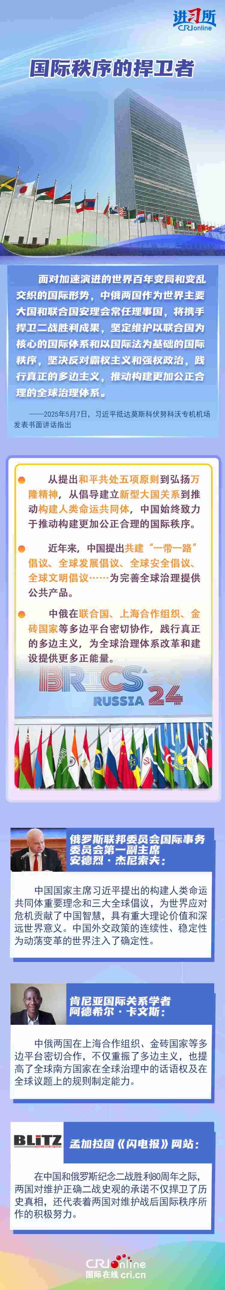 “兩國(guó)人民用鮮血和生命凝結(jié)的深厚情誼,如黃河之水奔騰不息,似伏爾加河寬廣深沉,成為中俄世代友好的不竭源泉。”今年是中國(guó)人民抗日戰(zhàn)爭(zhēng)、蘇聯(lián)偉大衛(wèi)國(guó)戰(zhàn)爭(zhēng)暨世界反法西斯戰(zhàn)爭(zhēng)勝利80周年,也是聯(lián)合國(guó)成立80周年。在這一重要?dú)v史時(shí)間節(jié)點(diǎn),習(xí)近平主席此訪不僅為中俄關(guān)系發(fā)展注入強(qiáng)勁動(dòng)力,也向世界宣示中俄兩國(guó)攜手捍衛(wèi)二戰(zhàn)勝利成果的堅(jiān)定意志。