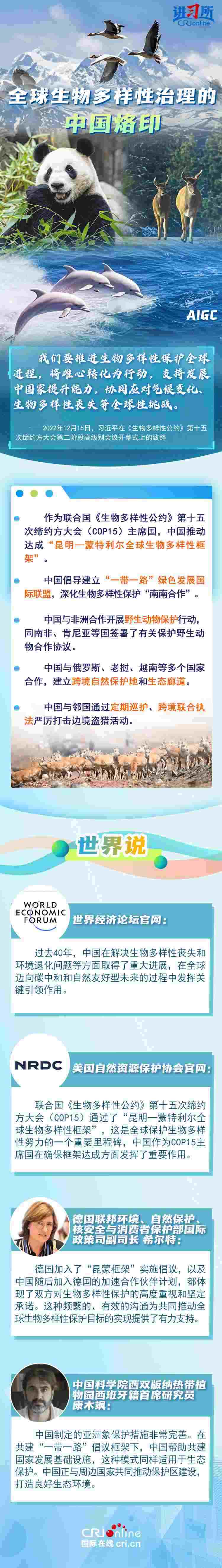 “心往一處想、勁往一處使,共建地球生命共同體?!弊鳛樽钤绾炇稹⑴鷾省渡锒鄻有怨s》的締約方之一,生物多樣性保護已經(jīng)上升為中國的國家發(fā)展戰(zhàn)略。國際人士表示,中國的一系列舉措體現(xiàn)出對生態(tài)環(huán)境保護的堅定決心,同時,中國依托共建“一帶一路”倡議等國際合作機制,為推動全球生物多樣性保護提供了有力支持,在邁向自然友好型未來的過程中發(fā)揮關(guān)鍵的引領(lǐng)作用。