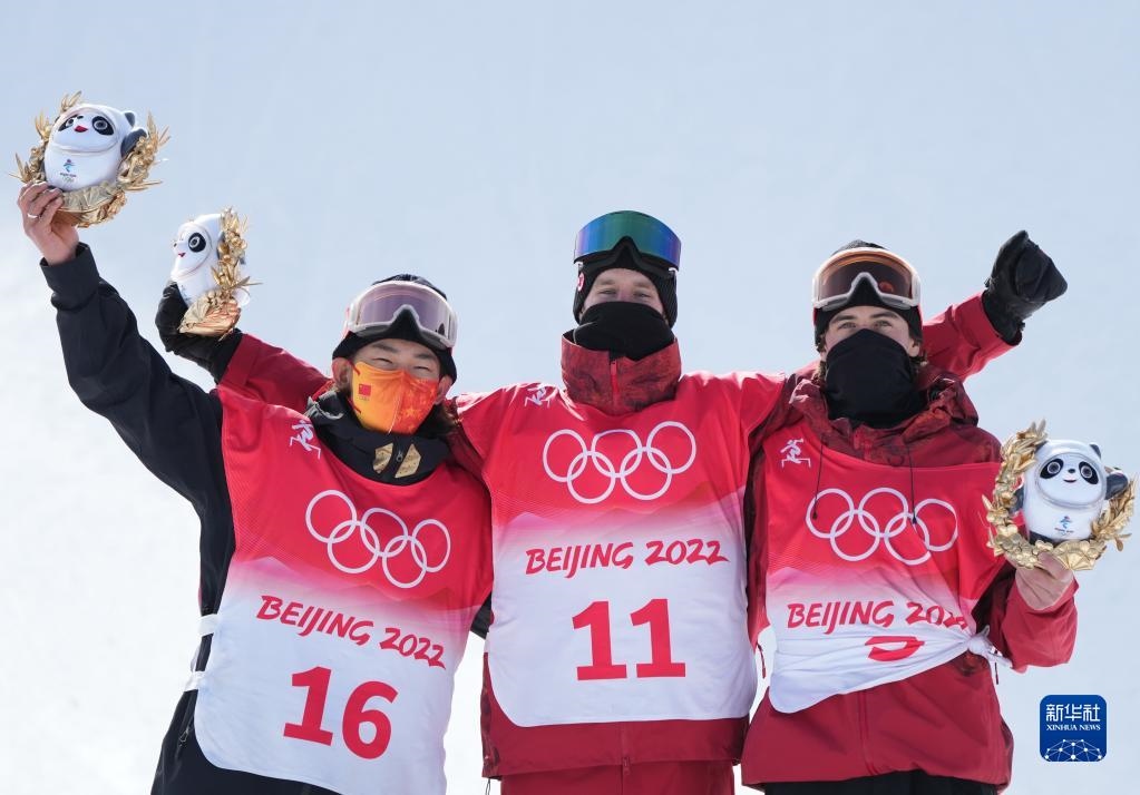 2月7日,獲得冠軍的加拿大選手馬克斯·帕羅特(中),獲得亞軍的中國選手蘇翊鳴(左)和獲得季軍的加拿大選手馬克·麥克莫里斯在頒發(fā)紀(jì)念品儀式上。新華社記者楊世堯攝