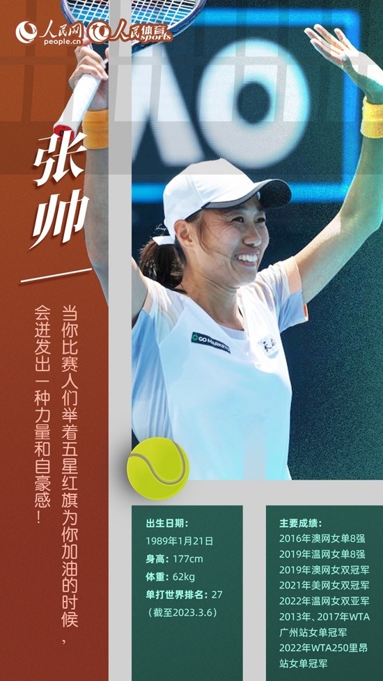 今年已經(jīng)34歲的張帥依然活躍在國際賽場上,賽季初她的單打世界排名升至第22位,創(chuàng)個(gè)人新高。澳網(wǎng)賽場,張帥單打闖進(jìn)16強(qiáng),雙打晉級第二輪。2月WTA500阿布扎站,張帥搭檔巴西球員史蒂芬妮獲得女雙冠軍,屬于老將的輝煌仍在繼續(xù)。