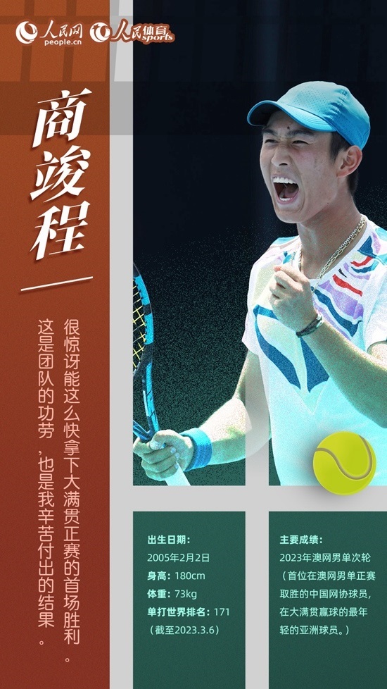 在今年的澳網(wǎng)賽場上,不滿18歲的商竣程讓人眼前一亮。資格賽連贏三場,首次參加大滿貫成人組賽事即打入正賽。正賽首輪,商竣程擊敗30歲的德國選手奧斯卡·奧特,取得大滿貫首勝,這也是公開賽年代以來中國網(wǎng)協(xié)球員在澳網(wǎng)男單正賽取得的首場勝利。盡管未能闖過第二輪,但作為本屆澳網(wǎng)男單正賽中最年輕的球員,商竣程在賽場上的沉穩(wěn)表現(xiàn),讓人們對于這名小將的未來有了更多期待。